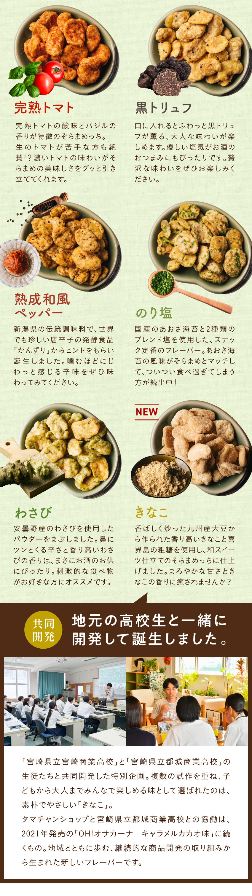 | 【栄養成分】【満潮の塩味】 (80gあたり)エネルギー:343kcal たんぱく質:16.6g 脂質:8.5g 炭水化物:49.9g 食塩相当量:1.36g 【柚子胡椒味】 (80gあたり)エネルギー:376kcal たんぱく質:13.7g 脂質:14.6g 炭水化物:47.3g 食塩相当量:1.13g 【七味醤油味】 (80gあたり)エネルギー:334kcal たんぱく質:16.2g 脂質:7.4g 炭水化物:50.6g 食塩相当量:1.28g 【スパイスジンジャー】 (80gあたり)エネルギー:368kcal タンパク質:16.8g 脂質:12.9g 炭水化物:46.2g 食塩相当量:0.40g 【卑弥呼味噌味】 (80gあたり)エネルギー:346kcal たんぱく質:17.6g 脂質:10.4g 炭水化物:45.2g 食塩相当量:1.04g 【ロディジャーノチーズ&ガーリック味】 (80gあたり)エネルギー:366kcal たんぱく質:14.74g 脂質:13.0g 炭水化物:47.6g 食塩相当量:0.88g 【完熟トマト&バジル】 (80gあたり)エネルギー:380kcal タンパク質:16.0g 脂質:14.4g 炭水化物:46.6g 食塩相当量:1.28g 【黒トリュフ】 (80gあたり)エネルギー:376kcal タンパク質:14.5g 脂質:14.0g 炭水化物:47.6g 食塩相当量:1.04g <!-- 【スパイス旨辛カレー(辛口)】 (100gあたり)エネルギー:459kcal タンパク質:19.9g 脂質:15.8g 炭水化物:59.2g 食塩相当量:0.94g --> 【熟成和風ペッパー】 (80gあたり)エネルギー:351kcal たんぱく質:15.6g 脂質:10.4g 炭水化物:48.4g 食塩相当量:1.69g 【のり塩】 (80gあたり)エネルギー:347kcal タンパク質:17.2g 脂質:8.5g 炭水化物:50.1g 食塩相当量:0.80g 【わさび味】 (80gあたり)エネルギー:349kcal たんぱく質:15.0g 脂質:8.2g 炭水化物:53.8g 食塩相当量:0.5g 【きなこ味】 (80gあたり)エネルギー:345kcal、たんぱく質:13.4g、脂質:9.0g、炭水化物:52.4g、食塩相当量:0.4g |
