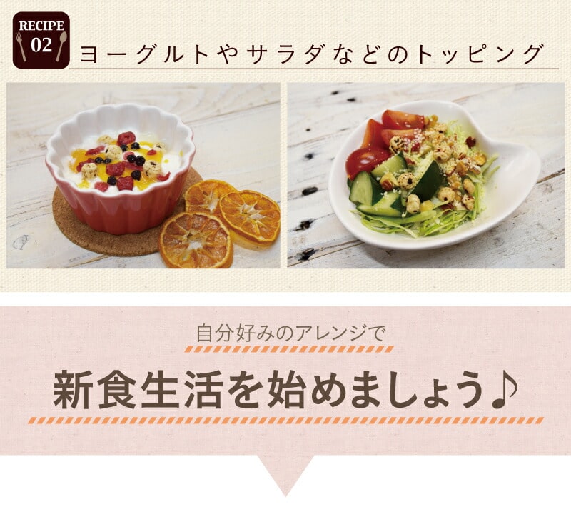 | 【使用方法】そのまま食べたり・ヨーグルトに入れてお召し上がり下さい。 料理やスイーツ・サラダにもお使いいただけます。  |