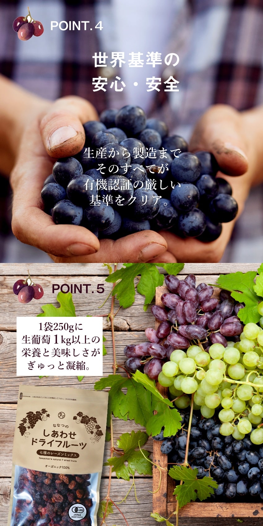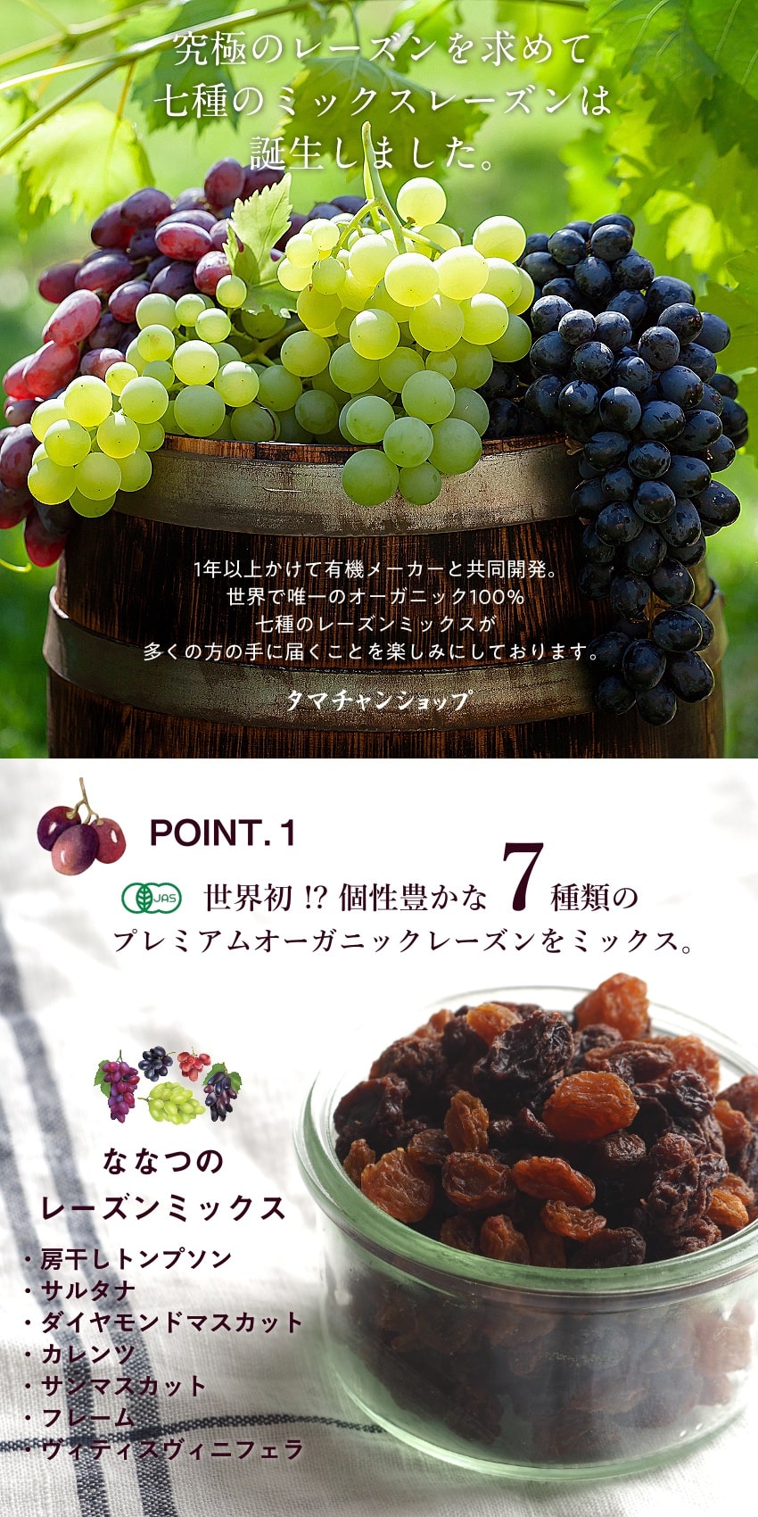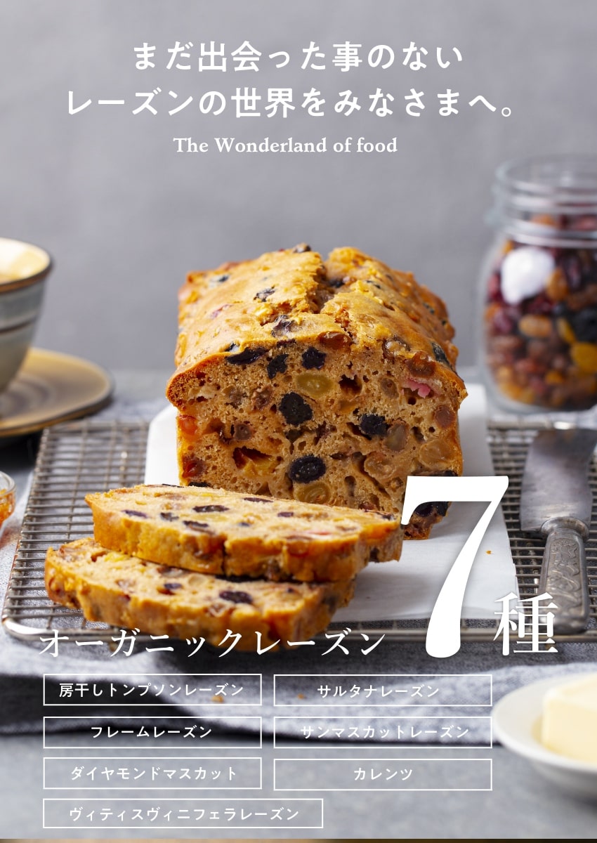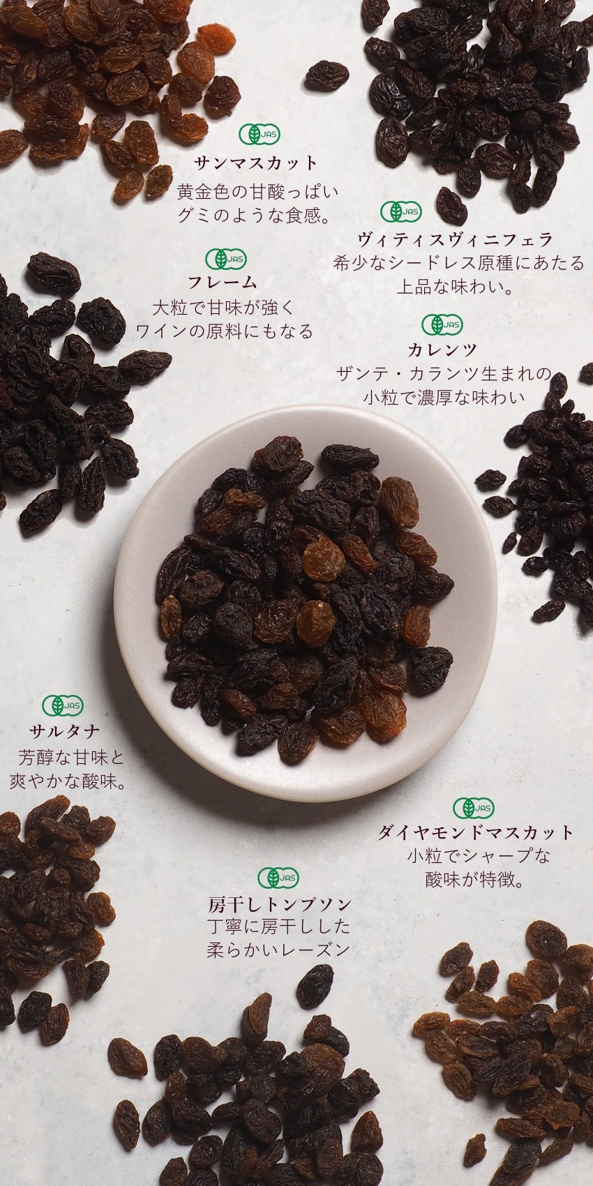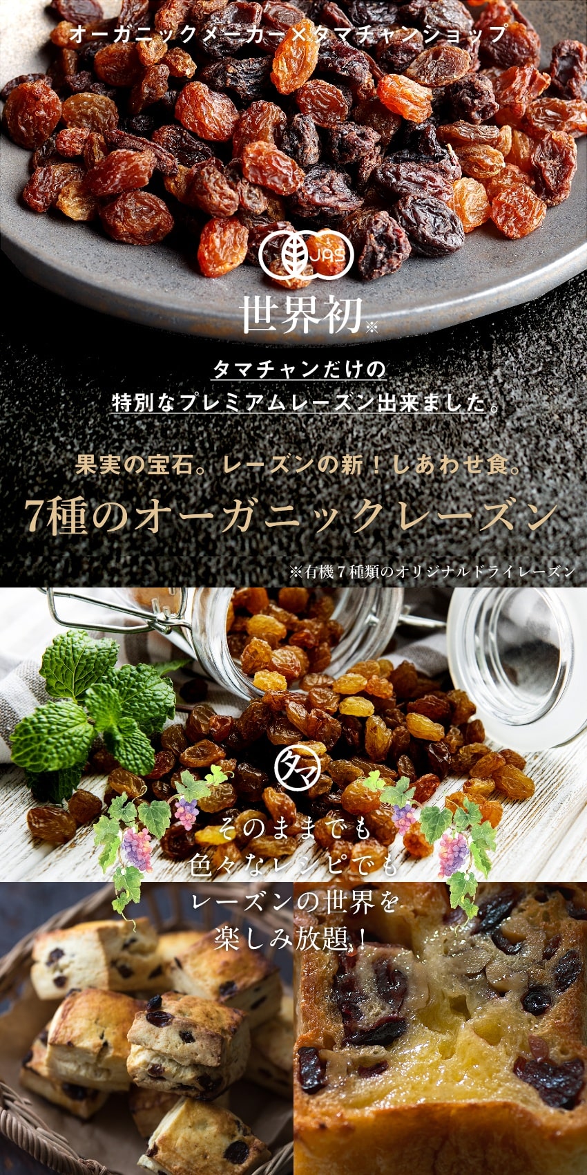 | 【原材料】有機トンプソンレーズン(アメリカ産)、有機サルタナレーズン(トルコ産)、有機サンマス カットレーズン(オーストラリア産)、有機ダイヤモンドマスカットレーズン(オーストラリア産)、有機カレンツ(アメリカ産)、有機フレームレーズン(アメリカ産)、有機ヴィティス・ヴェニフェラレーズン(トルコ産) ※製造工場では、アレルギー特定原料28品目のうち乳成分・小麦・アーモンド・オレンジ・カシューナッツ・キウイフルーツ・くるみ・ごま・大豆・バナナ・りんご・ゼラチン・やまいもを含む製品を製造しています。 |