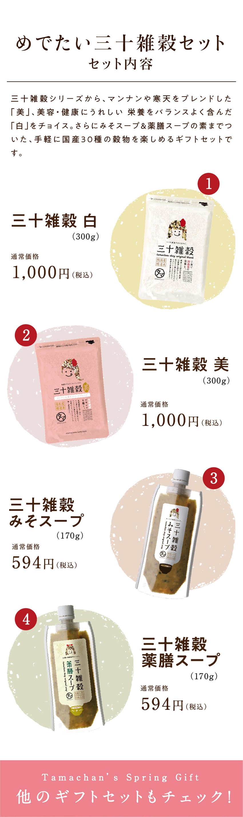 | 【内容量】三十雑穀(白・美):各300g/三十雑穀スープ(みそ・薬膳):各170g | |