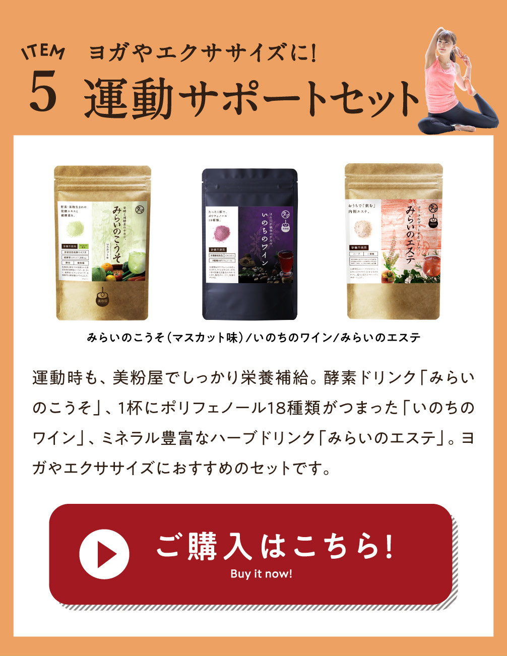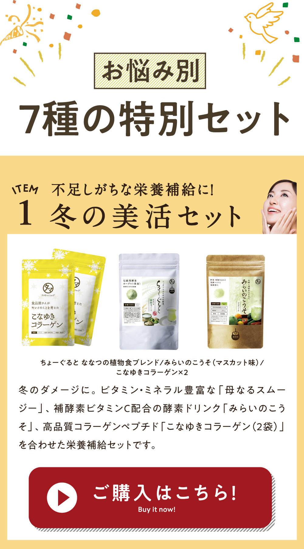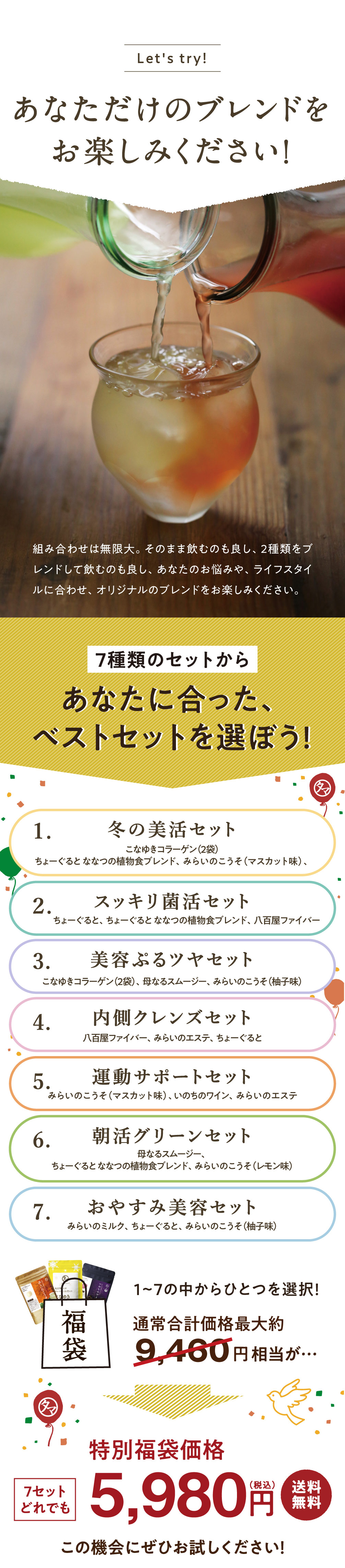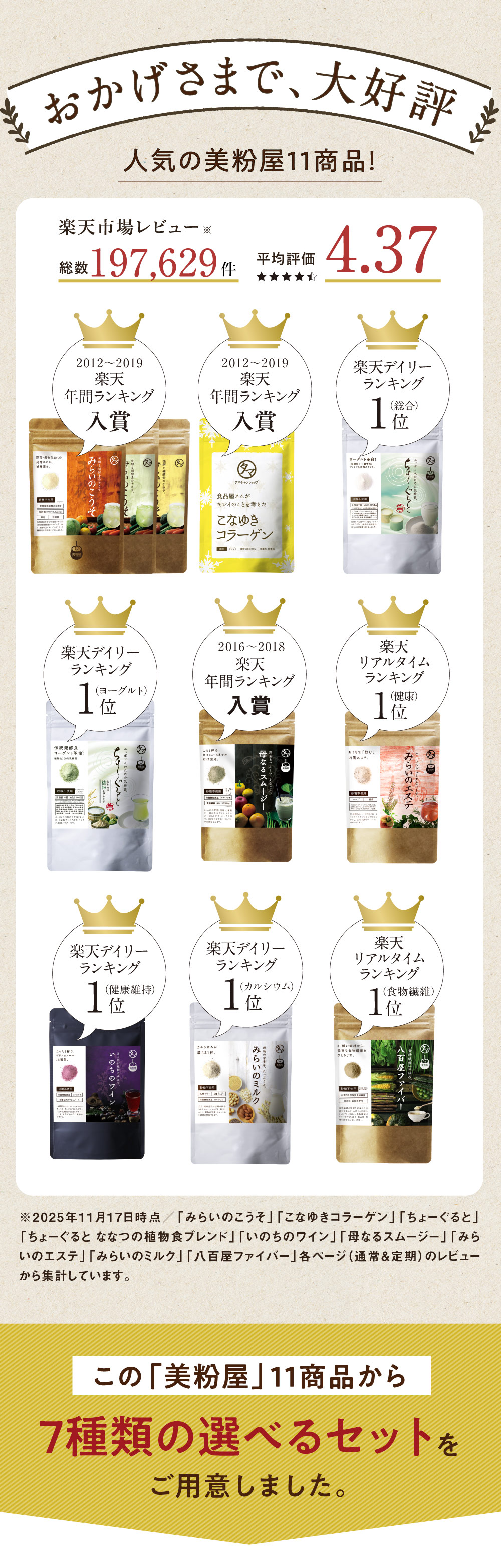 | 【内容量】みらいのこうそ100g/こなゆきコラーゲン100g/みらいのエステ100g/母なるスムージー150g/ちょーぐると100g/植物性ちょーぐると100g/いのちのワイン100g/八百屋ファイバー180g/みらいのミルク100g 上記の中から7種類の組み合わせをご用意しております。 | |