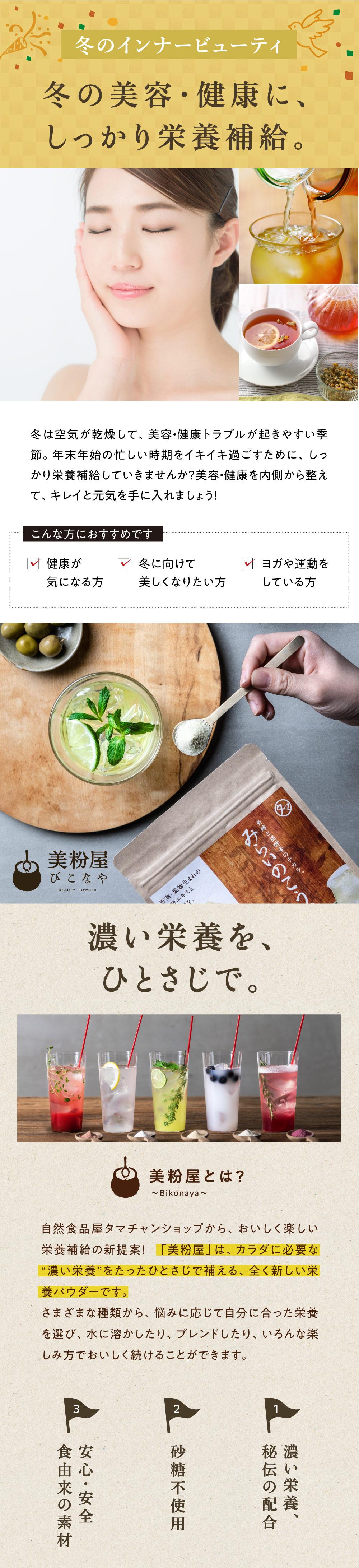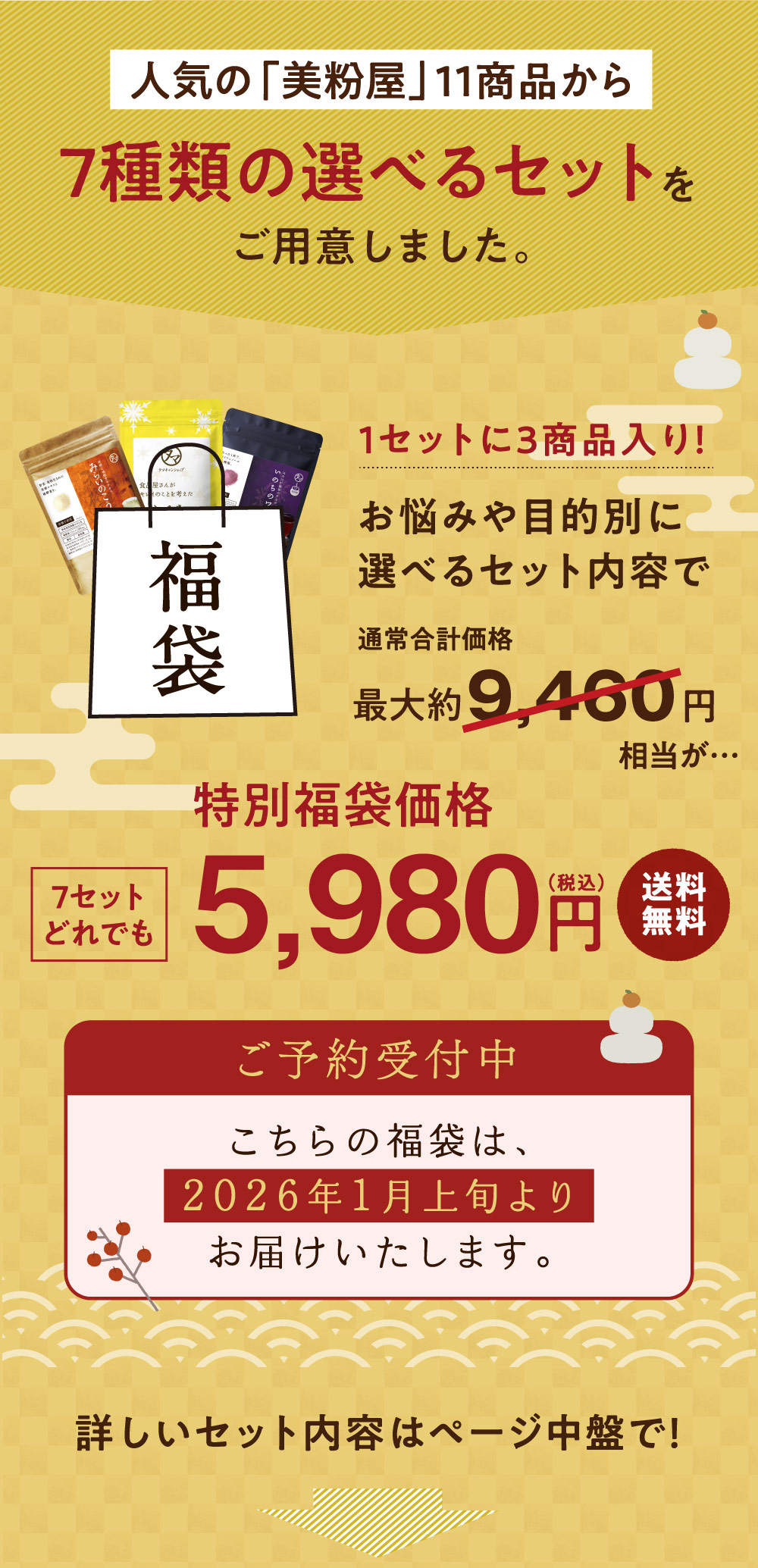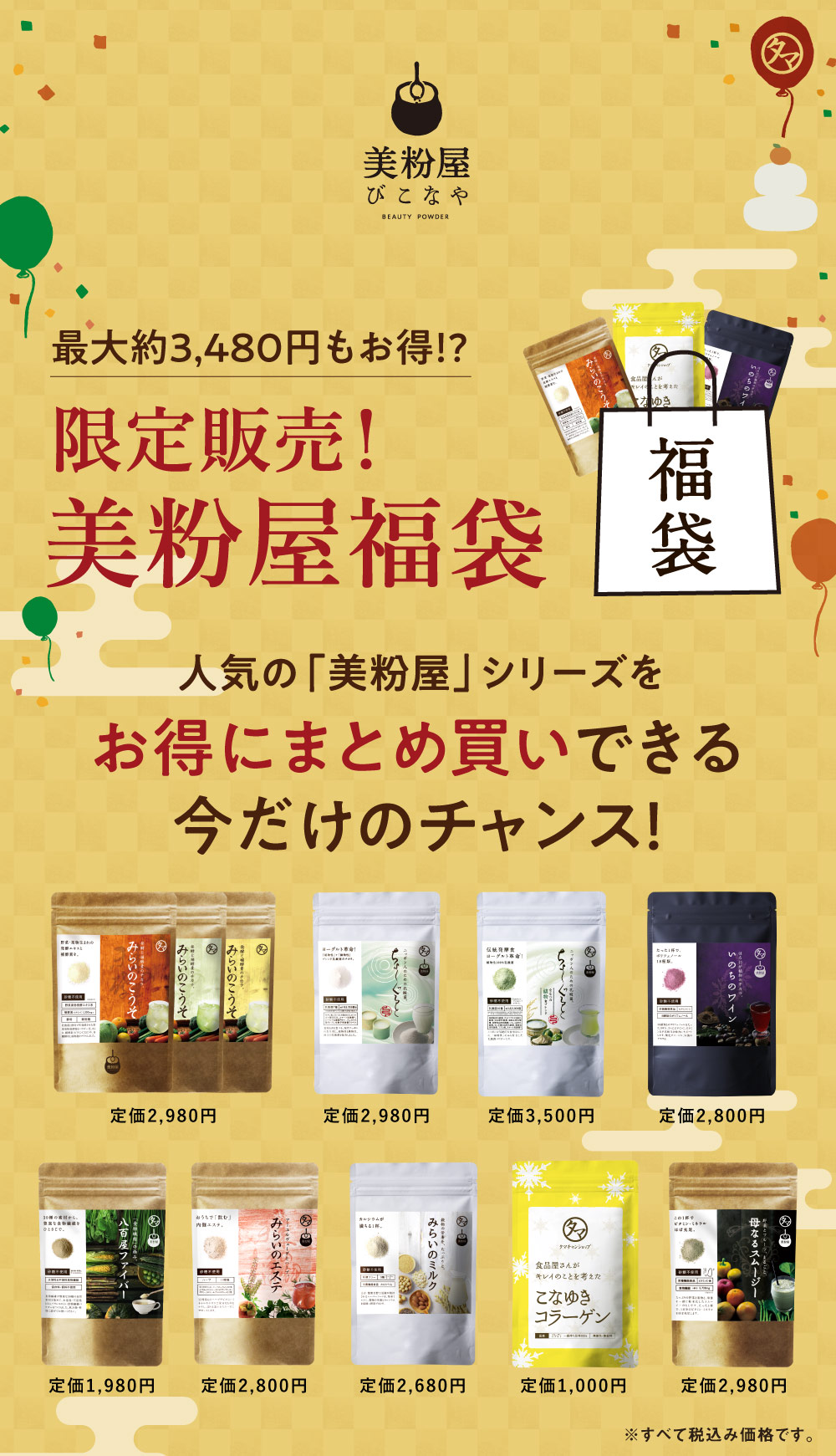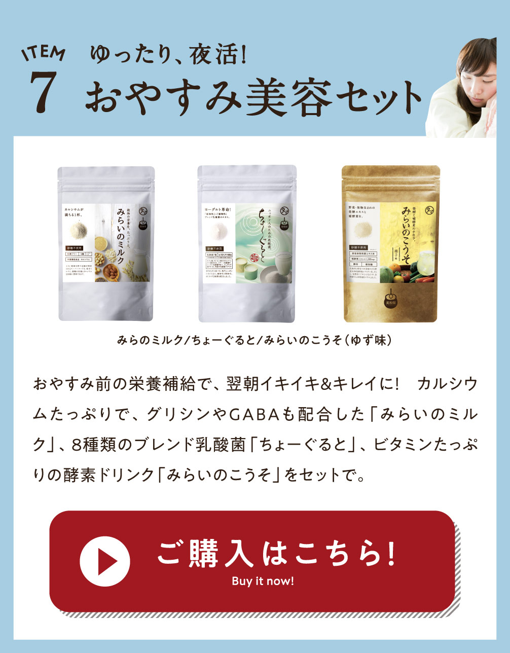 | 【内容量】みらいのこうそ100g/こなゆきコラーゲン100g/みらいのエステ100g/母なるスムージー150g/ちょーぐると100g/植物性ちょーぐると100g/いのちのワイン100g/八百屋ファイバー180g/みらいのミルク100g 上記の中から7種類の組み合わせをご用意しております。 | |