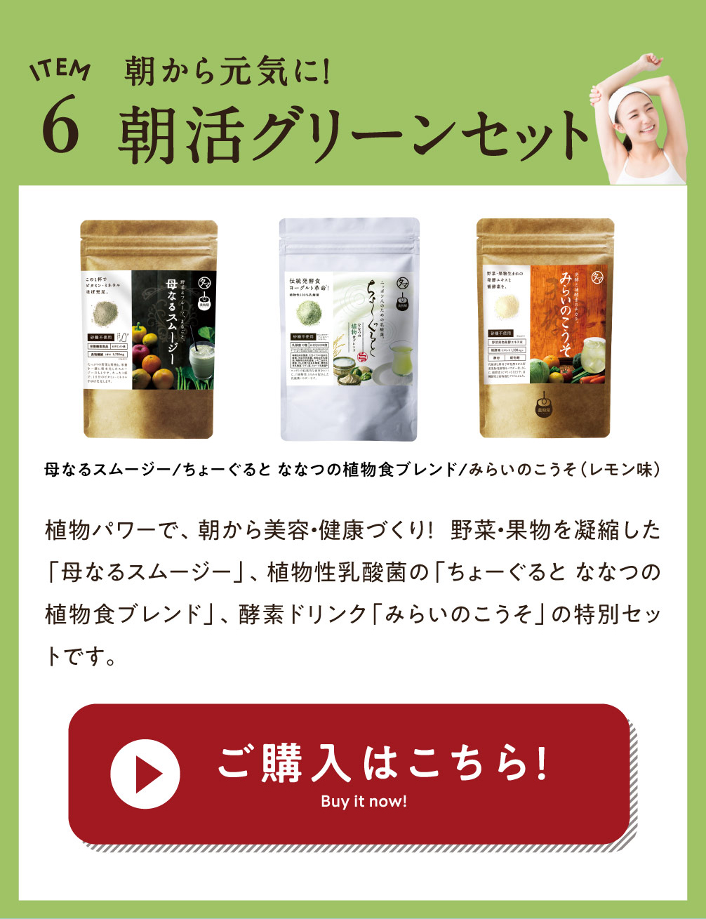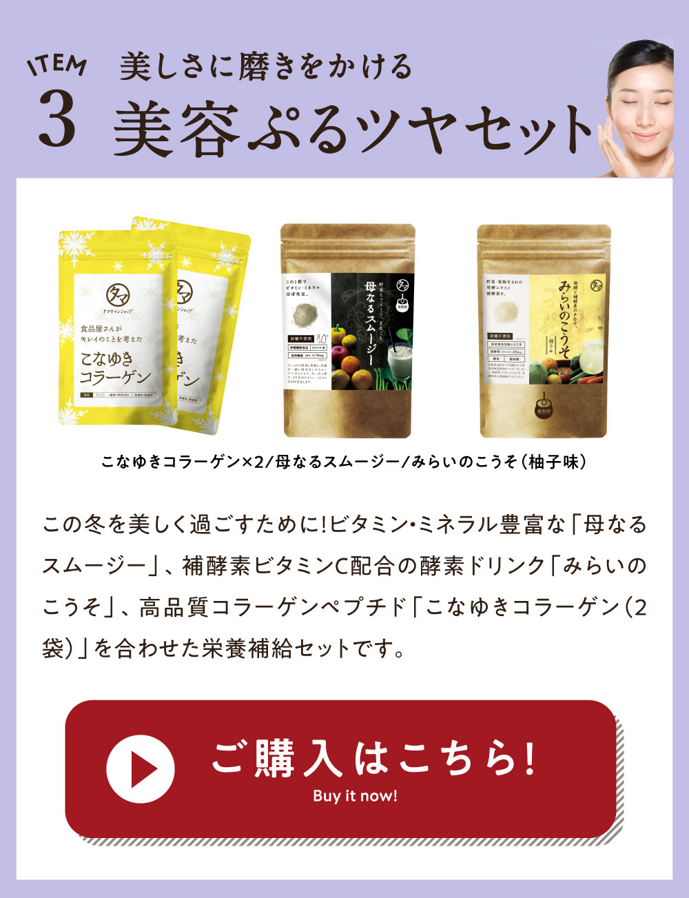 | 【栄養成分】みらいのこうそはこちら こなゆきコラーゲンはこちら ちょーぐるとはこちら 植物性ちょーぐるとはこちら いのちのワインはこちら 母なるスムージはこちら みらいのエステはこちら ショクササイズはこちら みらいのミルクはこちら 八百屋ファイバーはこちら |