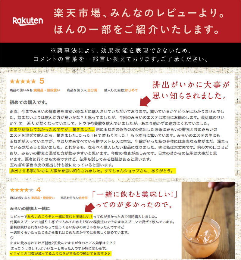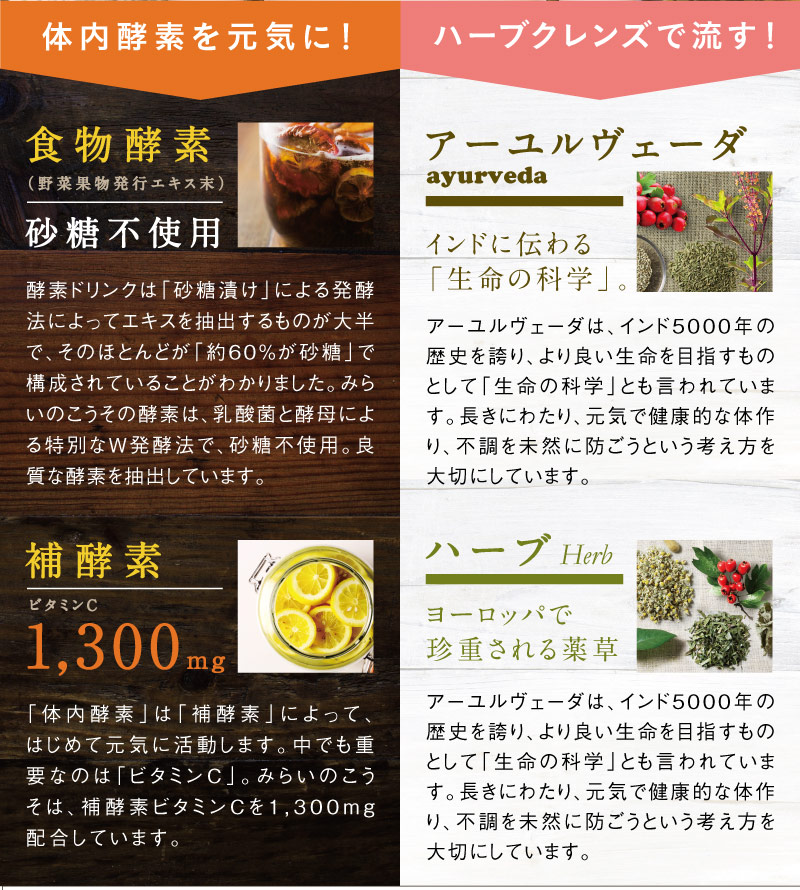 | 【原材料】【みらいのエステ】 直鎖オリゴ糖、フラクトオリゴ糖、難消化性デキストリン、生姜(黄金生姜)、システインペプチド含有酵母エキス、MSM、亜 鉛含有酵母、 ウラジロガシ抽出エキス末、紅景天末、イチゴ 抽出物、タマネギ薄皮エキス末、ツルアラメエキス末、混合 ハーブ抽出物(ドクダミ、セイヨウサンザシ、ローマカミツレ、ブドウ葉)、 アムラ抽出エキス末、マンゴスチン抽出エキス末、白ゴマエキス末、ホーリーバジルエキス末、ローズマリー末、食塩(岩塩)、セレン含有酵母、ビタミンC、香料(レモン、ショウガ)、紅麹色素、 クエン酸、乳酸カルシウム、カロテン色素、甘味料(ステビア、スクラロース)、ヘム鉄(豚由来)、L-メチオニン、グリシン、L-グルタミン、L-シスチン、ビタミンE、ナイアシン、ラクトフェリン(乳由来)、 パントテン酸Ca、ビタミンB1、ビタミンB6、ビタミンB2、ビタミンA、葉酸、ビタミンD、ビタミンB12 天然素材使用のため多少色むらが生じることがありますが、品質には問題ございません 【みらいのこうそ】 デキストリン(鹿児島県、宮崎県産)、さつまいも澱粉(鹿児島県、宮崎県産)、野菜果物発酵エキス末(ダイコン、人参、カブ、キュウリ、トマト、ピーマン、オクラ、カイワレ、にら、キャベツ、白菜、レタス、菊菜、もやし、チンゲン菜、水菜、間引き菜、ターサイ、パセリ、セロリ、ふき、アスパラガス、ブロッコリー、カリフラワー、ねぎ、セリ、唐辛子、芽キャベツ、ナス、生姜、大豆もやし、モロヘイヤ、空芯菜、三つ葉、サニーレタス、サンチュ、サラダ菜、小松菜、とうみょう、しし唐、パプリカ、プリンスメロン、パイナップル、スイカ、キウイフルーツ、みかん、オレンジ、イチジク、はっさく、ポンカン、ゆず、金柑、イチゴ、リンゴ、ぶどう、梨、柿、スダチ、カボス、シメジ、エノキ茸、椎茸、舞茸、ヒジキ、コンブ、デキストリン)、ローズヒップ末、桑の葉エキス末、アセロラ果汁末、システインペプチド含有酵母末、もろみ粉末、亜鉛含有酵母末、ビール酵母末、穀物麴末(大麦、あわ、ひえ、タカキビ、紫黒米、米粉)、セレン含有酵母末、フルーツエキス末(オレンジ、グレープフルーツ、レッドオレンジ、ガラナエキス、マルトデキストリン)、フルーツ・野菜エキス末(ぶどう、トマト、人参、ビルベリー、茶葉、グレープフルーツ、パパイヤ、パイナップル、イチゴ、りんご、アプリコット、さくらんぼ、オレンジ、ブラックカラント、ブロッコリー、キャベツ、玉ねぎ、にんにく、オリーブ、キュウリ、アスパラガス)/ビタミンC、甘味料(羅漢果抽出物、ステビア)、香料、ニコチン酸アミド、パントテン酸カルシウム、ビタミンE、ビタミンB6、ビタミンB2、ビタミンB1、ビタミンA、葉酸、ビタミンD、ビタミンB12 ※原材料に遺伝子組み換え原料は使用しておりません。 |
