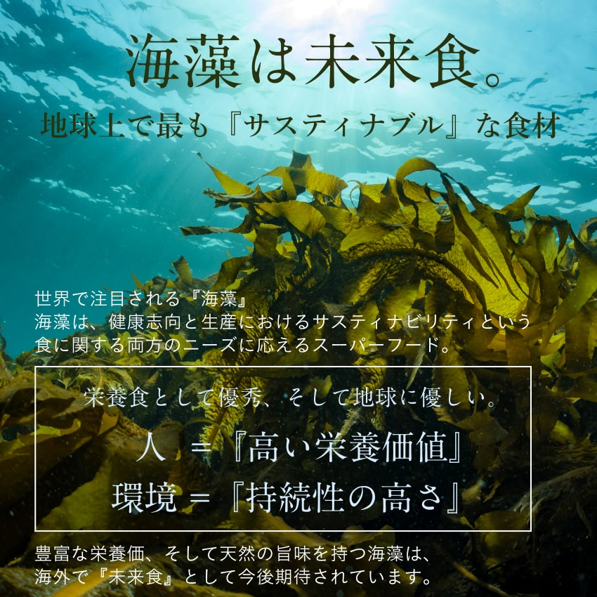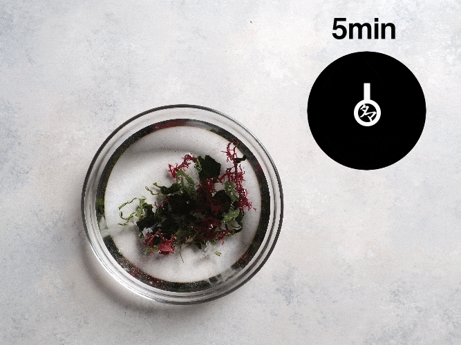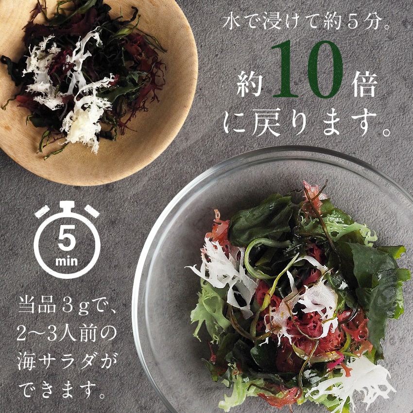 | 【使用方法】1.ボウルにたっぷり水を入れ、海藻を約5分間水戻ししてください。 2.海藻が十分に広がりましたら、ざるで水をしっかり切ってください。 ・サラダ、酢の物、カルパッチョなどにおすすめです。 ・汁物には戻さずそのままご使用いただけます。味噌汁の場合、ひとつまみ(約1g)を2~3分置いてお召し上がりください。 |