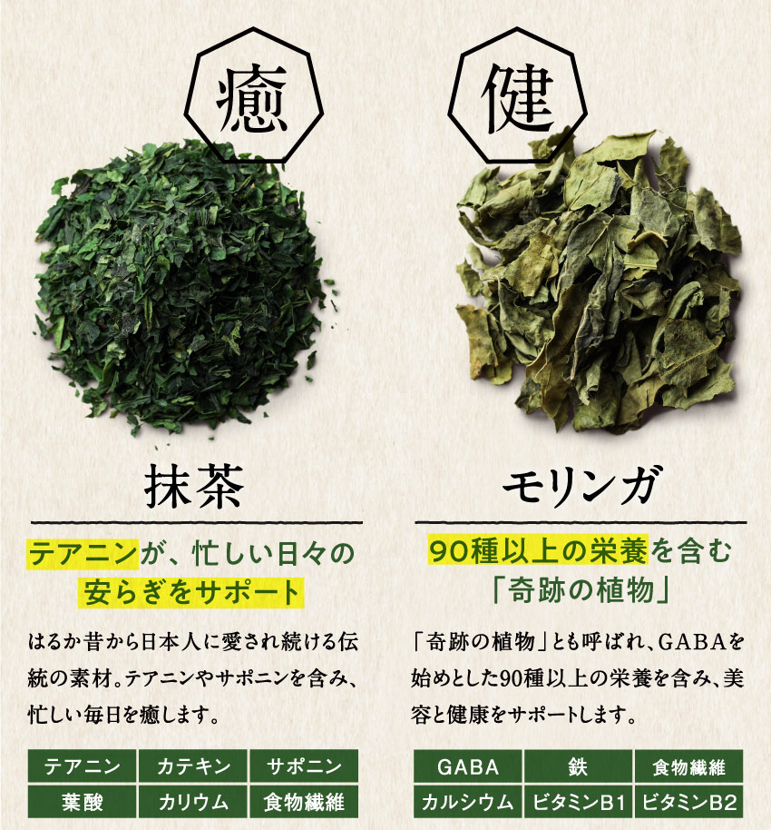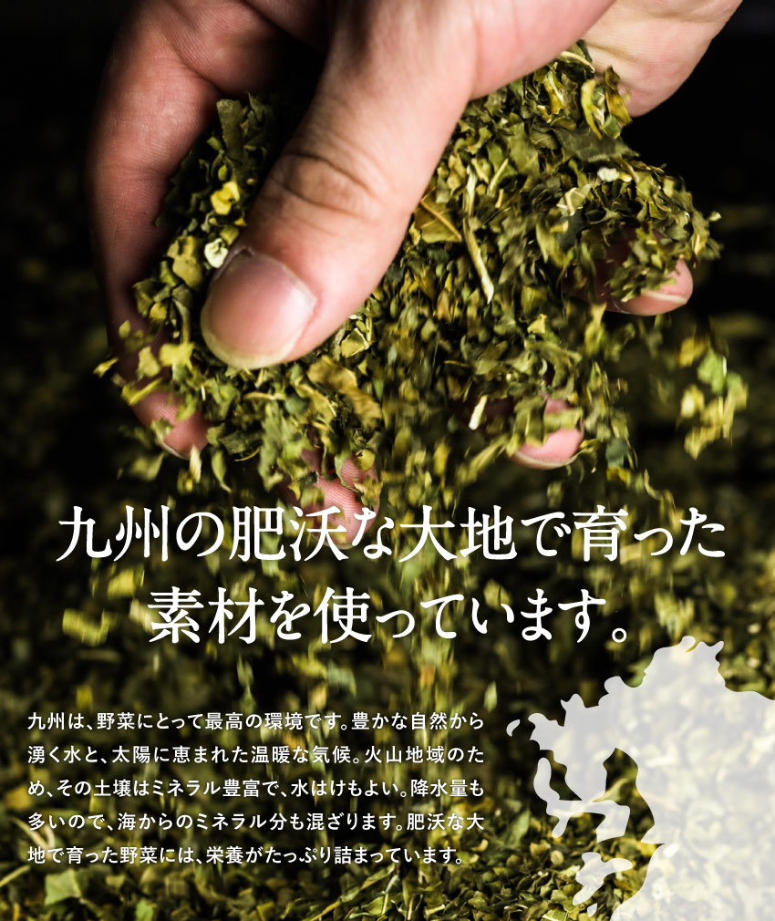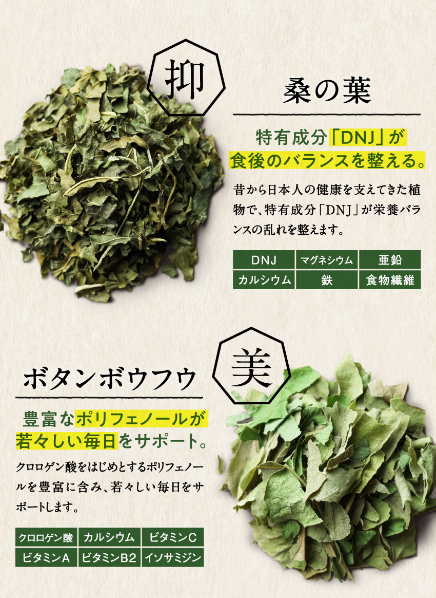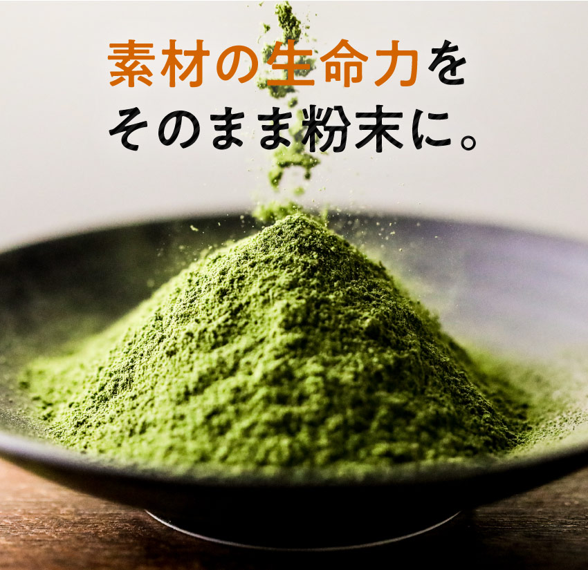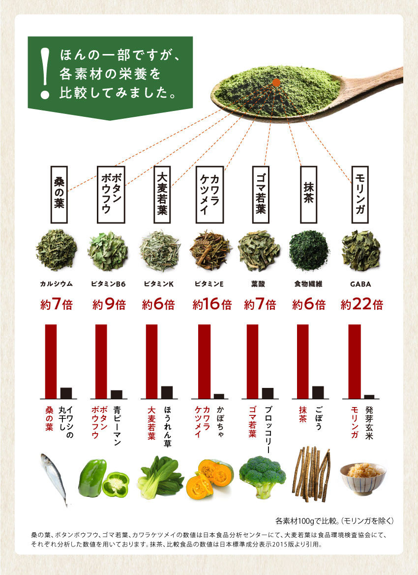 | 【原材料】有機桑葉末(桑葉(九州産))、有機大麦若葉末(大麦若葉(九州産))、さつまいも澱粉、有機カワラケツメイ末、有機長命草末、胡麻若葉末、有機抹茶末、モリンガパウダー ※妊娠中の方または可能性のある方はご使用をお控えください |