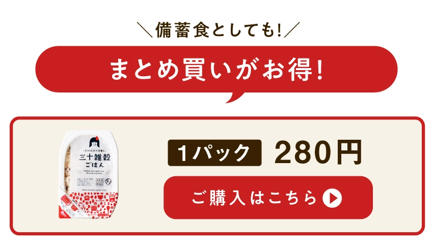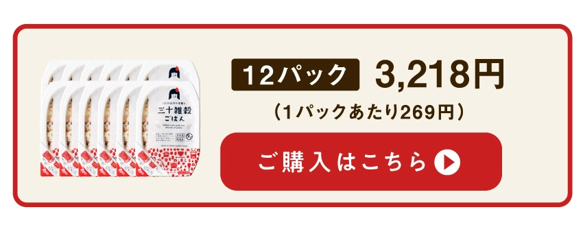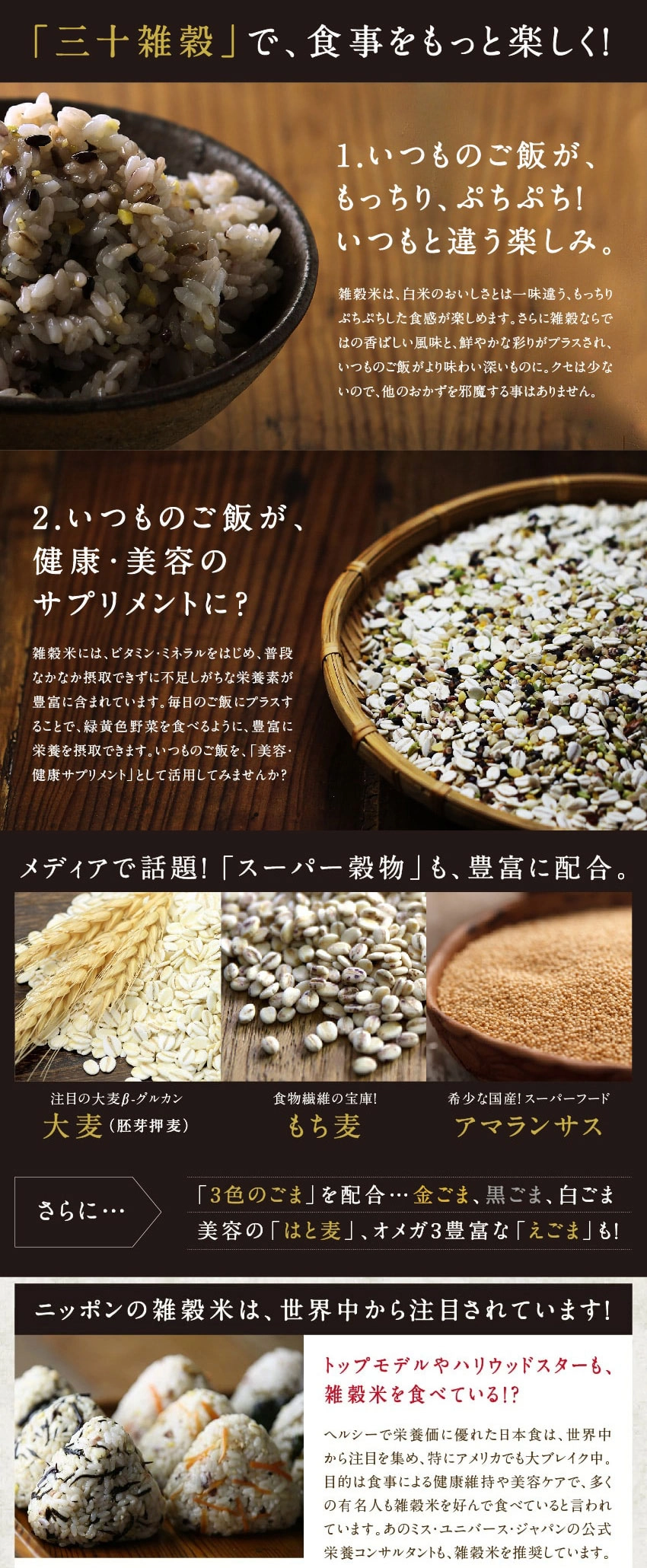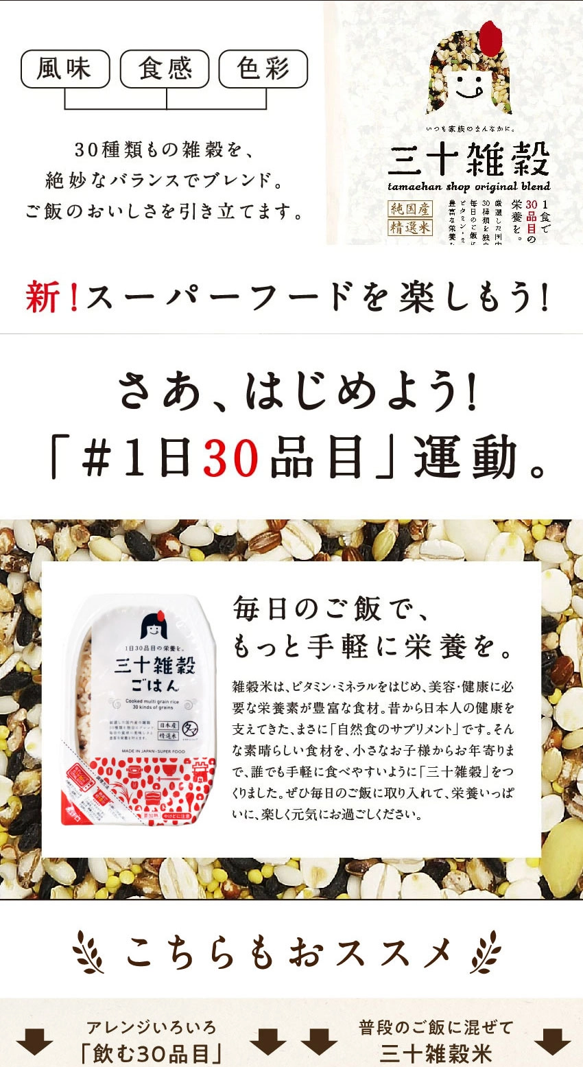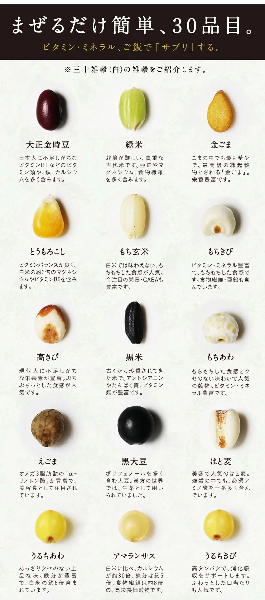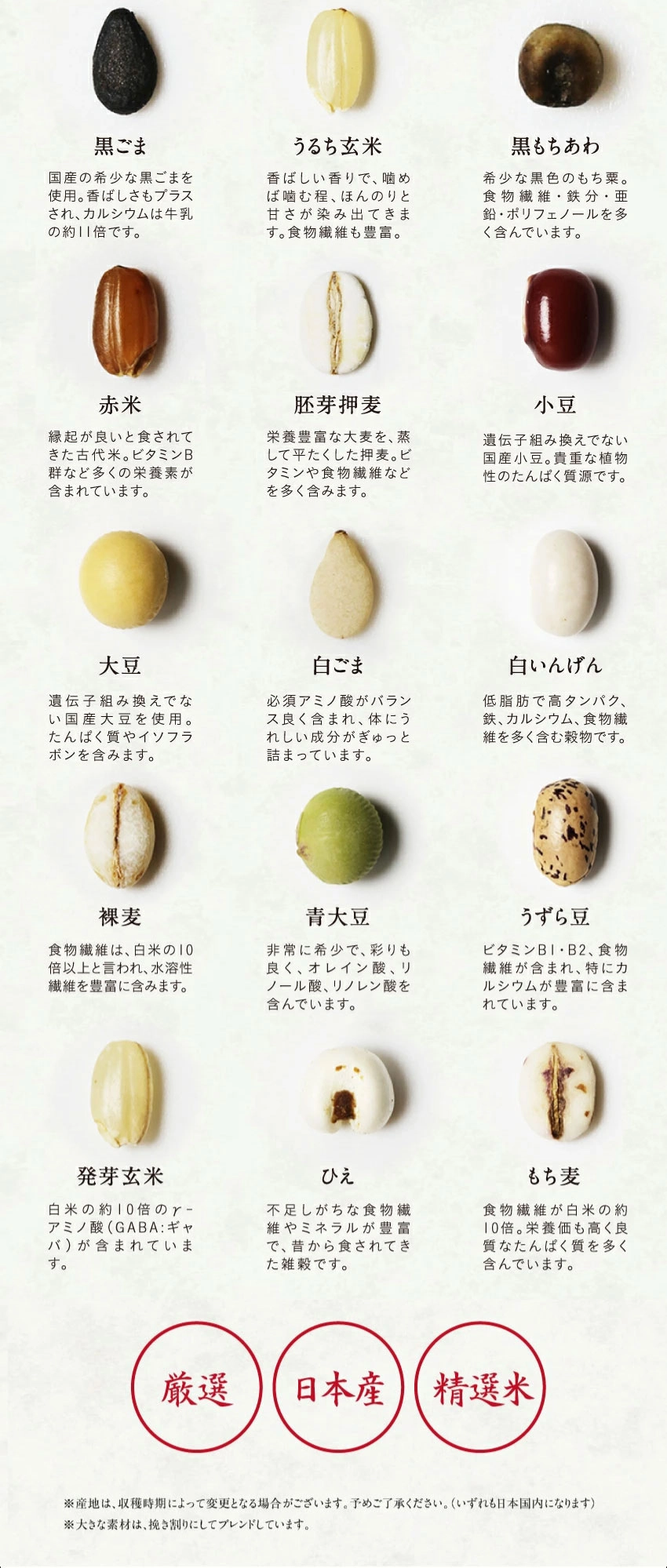 | 【原材料】うるち米(国産)、発芽押麦、うるち玄米、小豆、黒米、もちきび、青大豆、もち麦、大豆、もち粟、もち玄米、高きび、うるちきび、発芽玄米、インゲン豆、赤米、ひえ、黒もち粟、黒千石大豆、黒大豆、白大豆、ハト麦、赤大豆、赤えんどう豆、緑米、アマランサス、えごま、うるち粟、うずら豆、裸麦、大正金時、(一部に大豆を含む) | |