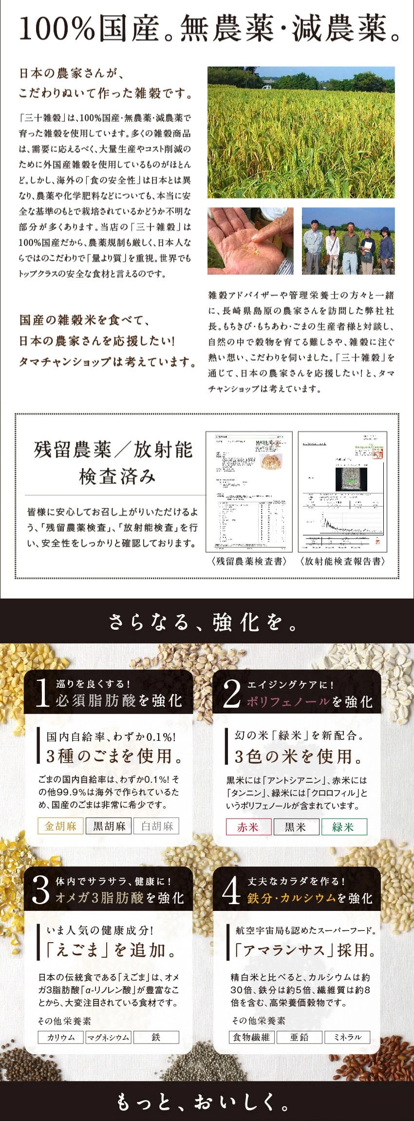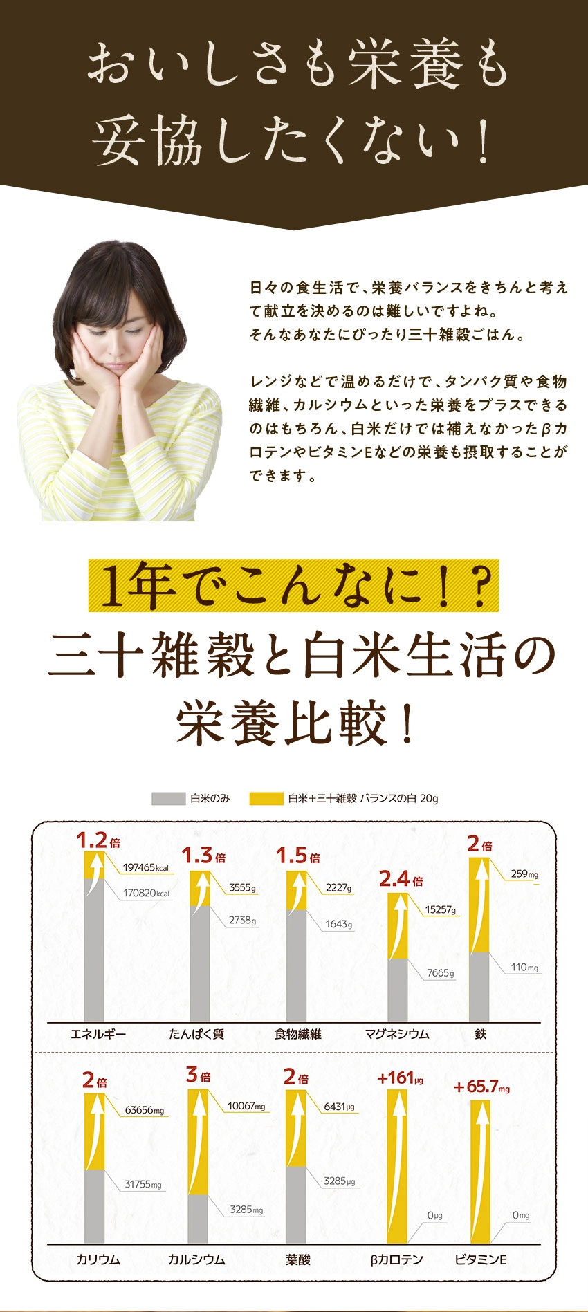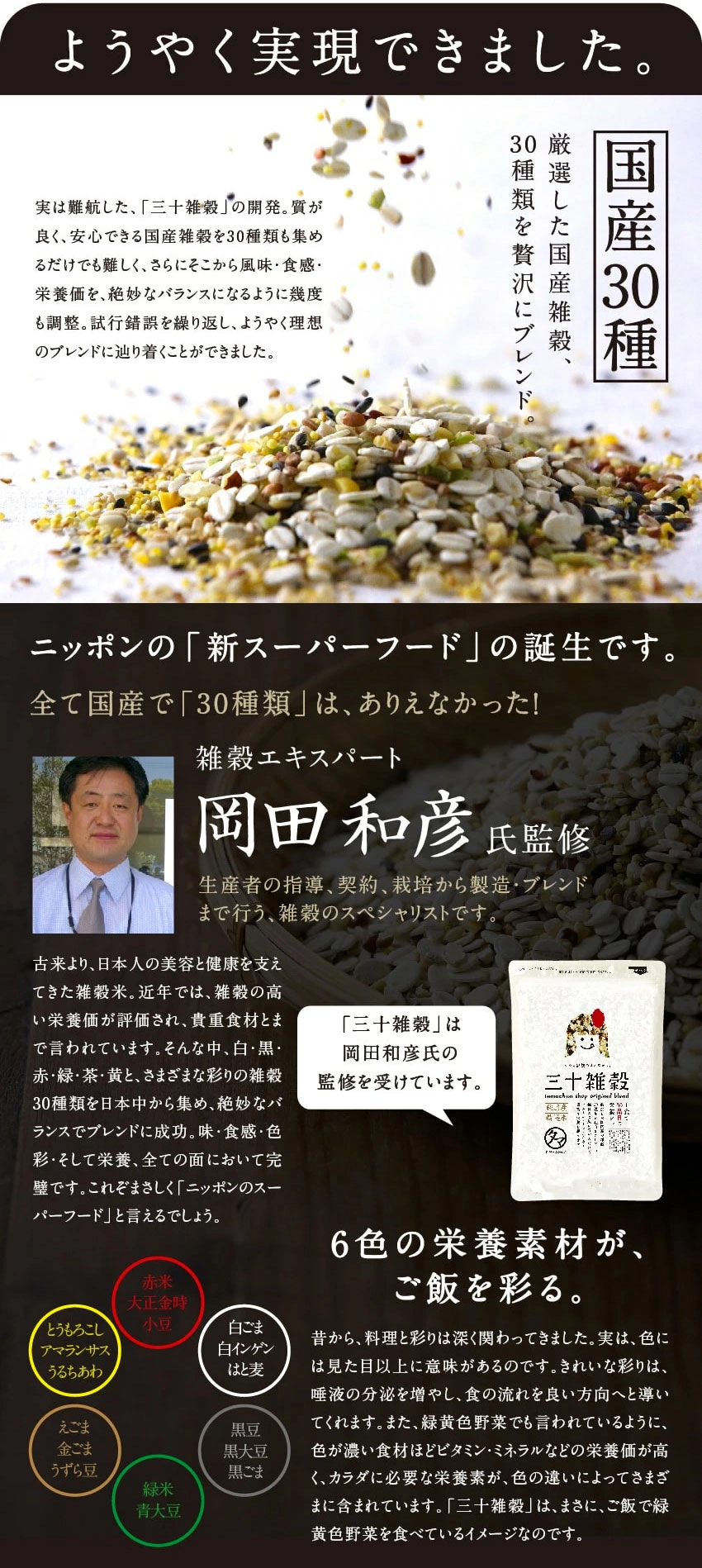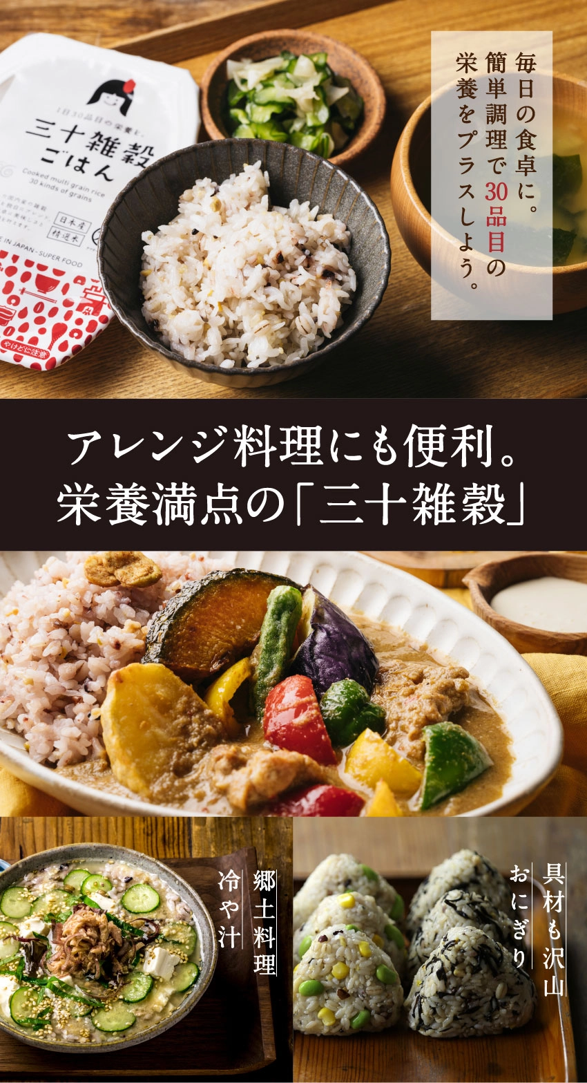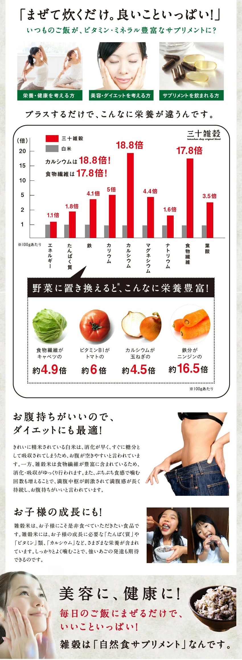 | 【原材料】うるち米(国産)、発芽押麦、うるち玄米、小豆、黒米、もちきび、青大豆、もち麦、大豆、もち粟、もち玄米、高きび、うるちきび、発芽玄米、インゲン豆、赤米、ひえ、黒もち粟、黒千石大豆、黒大豆、白大豆、ハト麦、赤大豆、赤えんどう豆、緑米、アマランサス、えごま、うるち粟、うずら豆、裸麦、大正金時、(一部に大豆を含む) | |