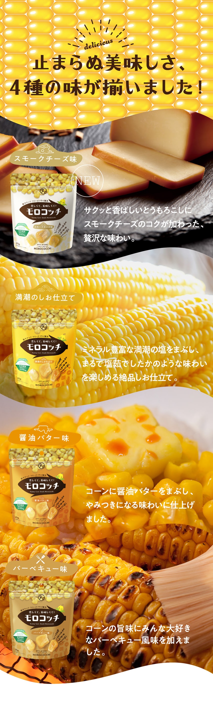 | 【栄養成分】<満潮のしお仕立て>エネルギー:107kcal たんぱく質:2.6g 脂質:2.3g 炭水化物:19g[糖質:16.9g 食物繊維:2.1g] 食塩相当量:0.4g <バーベキュー味>エネルギー:108.3kcal たんぱく質:2.6g 脂質:2.3g 炭水化物:19.2g[糖質:17.1g 食物繊維:2.1g] 食塩相当量:0.4g <醤油バター味>エネルギー:108.8kcal たんぱく質:2.6g 脂質:2.6g 炭水化物:18.8g[糖質:16.7g 食物繊維:2.1g] 食塩相当量:0.4g <スモークチーズ味>エネルギー:104.5kcal たんぱく質:3.1g 脂質:1.9g 炭水化物:18.9g[糖質:16.8g、食物繊維:2.1g] 食塩相当量:0.3g |