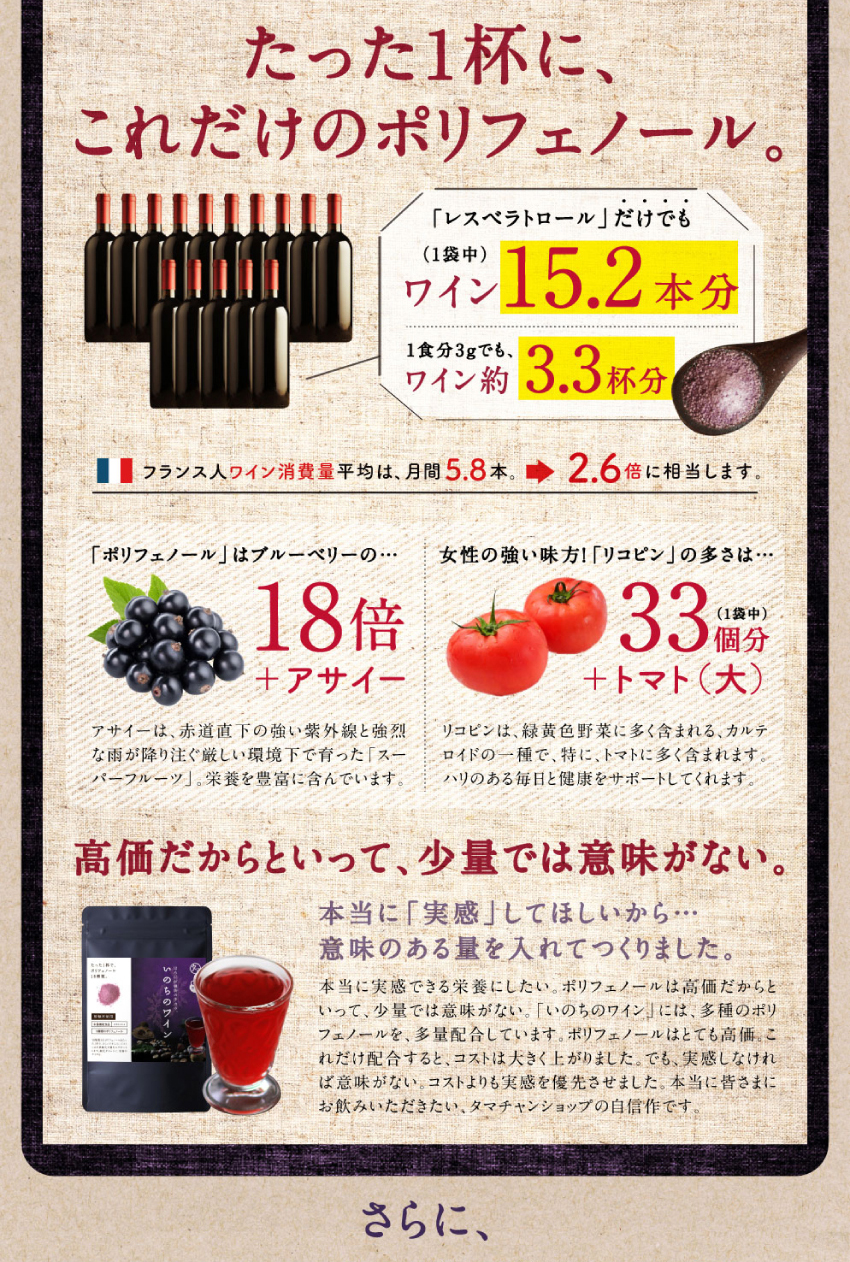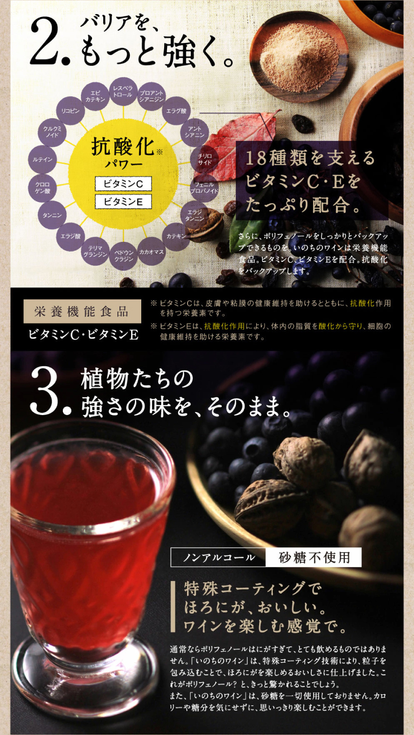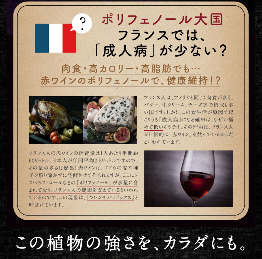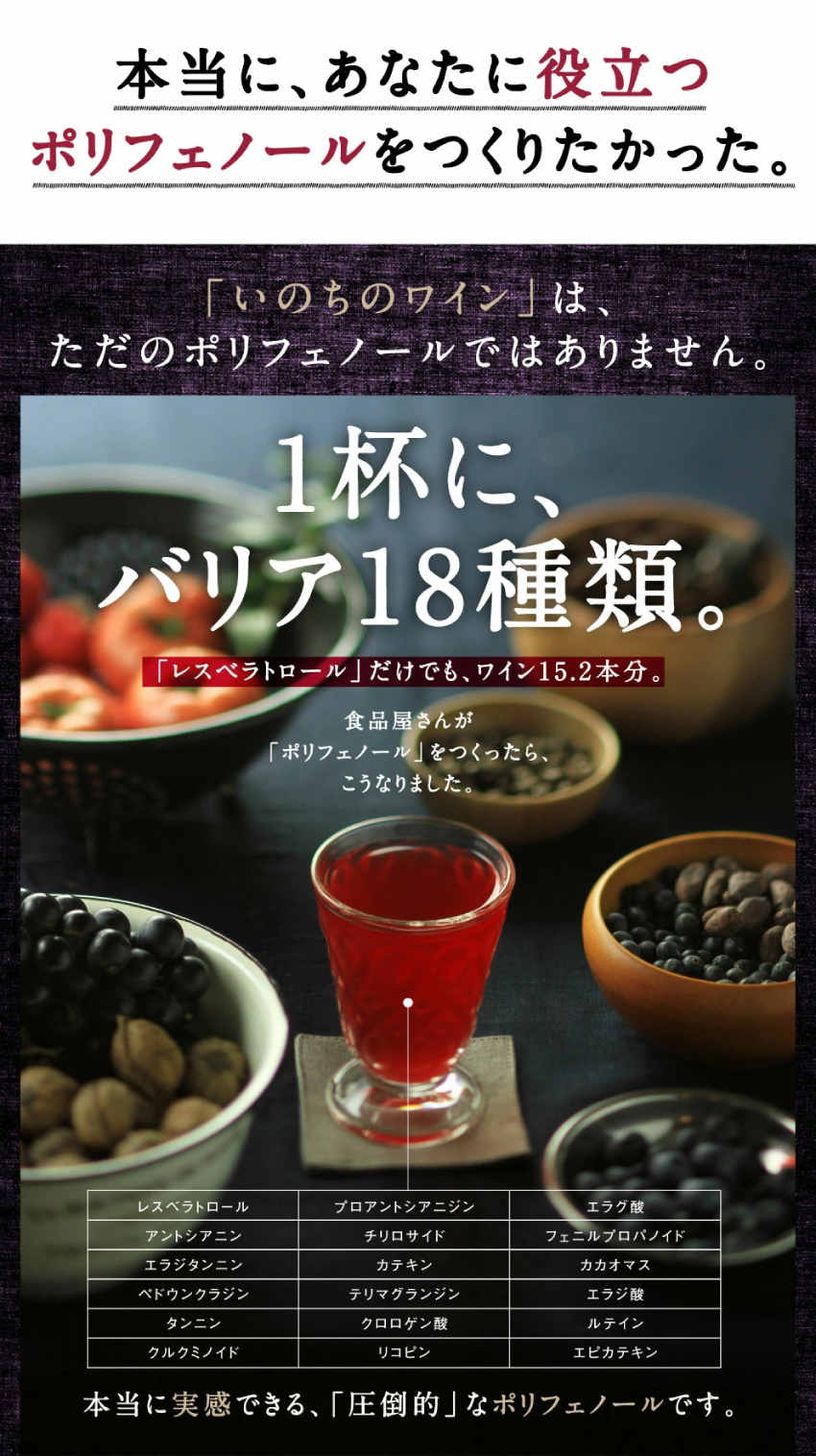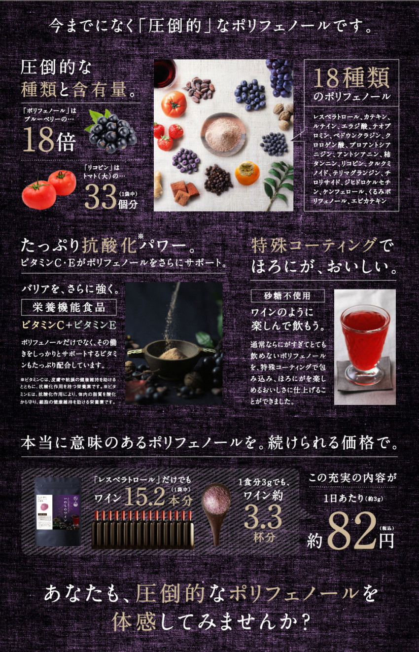| 【原材料】難消化性デキストリン(国内製造)、イソマルトオリゴ糖、澱粉分解物、赤ワインエキス末(トランス・レスベラトロール含有)、ブドウ種子エキス末(プロアントシアニジン含有)、アサイー末、黒大豆種皮エキス末(プロアントシアニジン含有)、カカオエキス末(テオブロミン含有)、茶抽出物(カテキン含有)、カシスエキス末(アントシアニン含有)、いちご種子エキス加工粉末(チリロサイド含有)、くるみポリフェノール、ブルーベリーエキス末(アントシアニン含有)、ブドウ皮抽出物(アントシアニン含有)、松樹皮エキス末(プロアントシアニジン含有)、ウコン抽出物(クルクミノイド含有)、生コーヒー豆抽出物(クロロゲン酸含有)/加工デンプン、ビタミンC、結晶セルロース、クエン酸、香料(ワイン)、甘味料(羅漢果抽出物)、マリーゴールド抽出物(ルテイン含有)、トマト抽出物(リコピン含有)、柿抽出物(柿タンニン含有)、ビタミンE、ナイアシン、パントテン酸カルシウム、ビタミンB2、ビタミンB1、ビタミンB6、ビタミンA、葉酸、ビタミンD、ビタミンB12、(一部に大豆・くるみを含む) 原材料で食物アレルギーの心配のある方、体調や体質に合わない場合は使用を中止してください。通院、投薬中の方は、担当医にご相談の上お召し上がり下さい。天然素材使用ため多少の色むらが生じることがありますが、品質には全く問題ございません | |