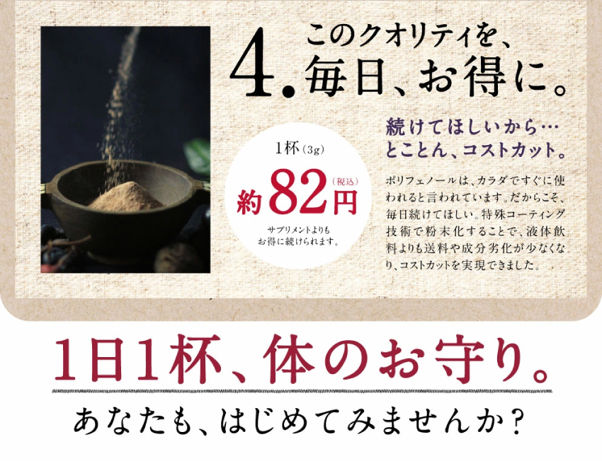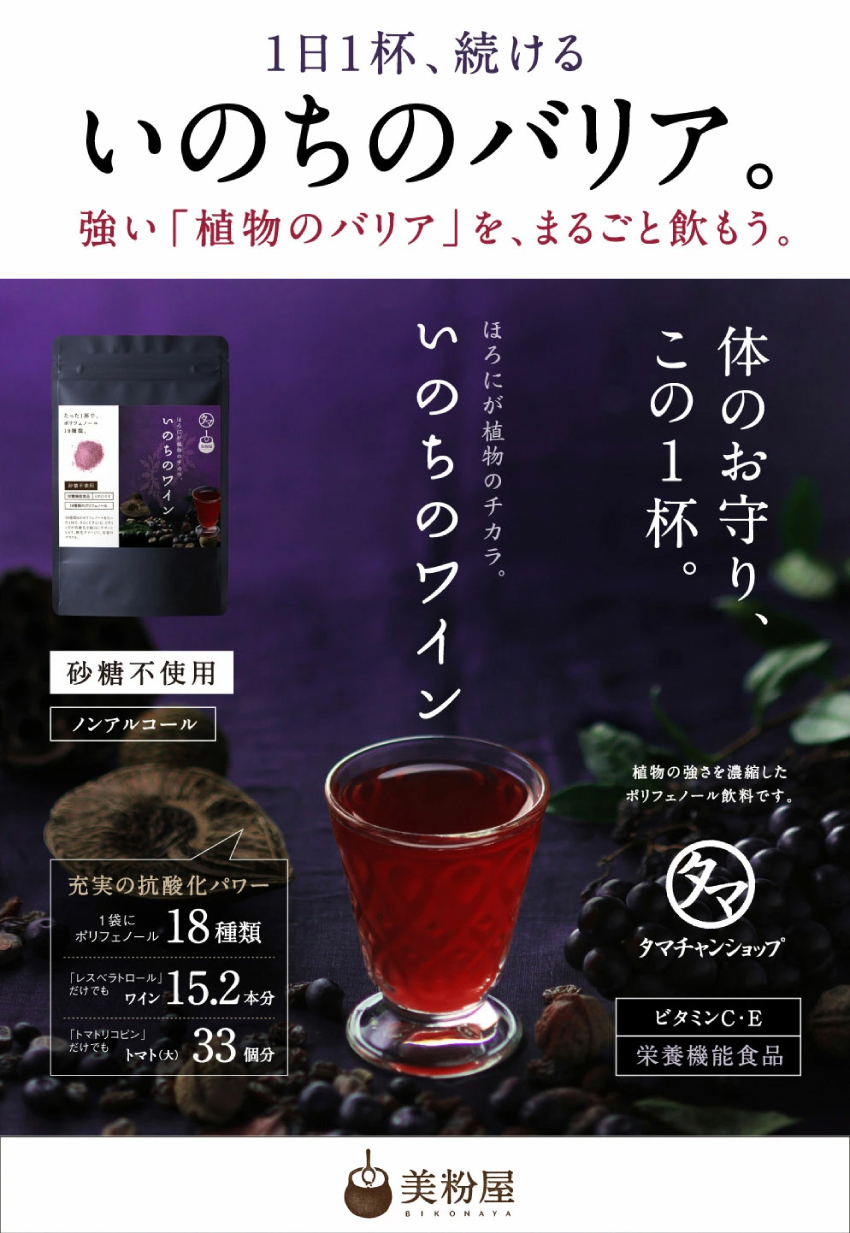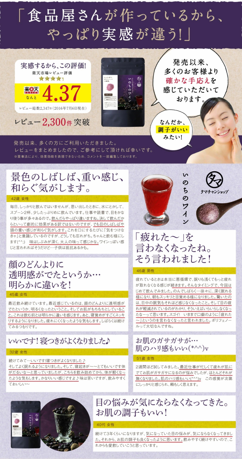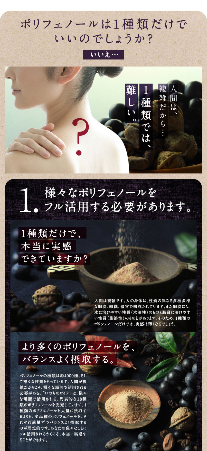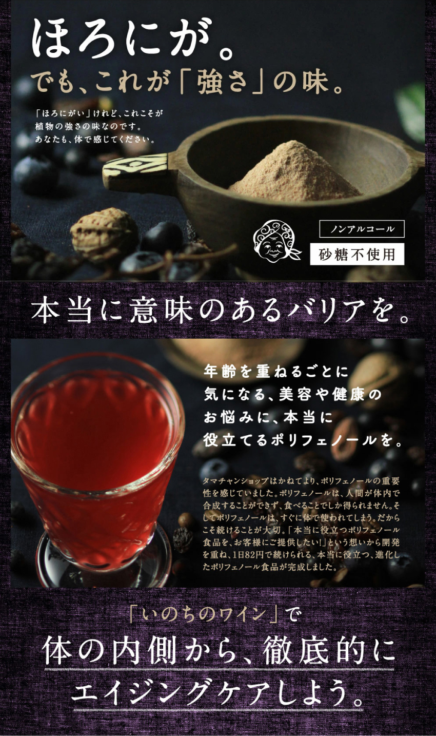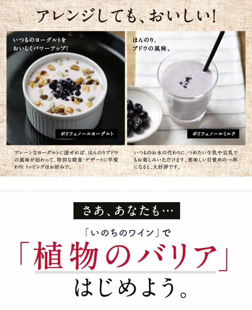 | 【原材料】難消化性デキストリン(国内製造)、イソマルトオリゴ糖、澱粉分解物、赤ワインエキス末(トランス・レスベラトロール含有)、ブドウ種子エキス末(プロアントシアニジン含有)、アサイー末、黒大豆種皮エキス末(プロアントシアニジン含有)、カカオエキス末(テオブロミン含有)、茶抽出物(カテキン含有)、カシスエキス末(アントシアニン含有)、いちご種子エキス加工粉末(チリロサイド含有)、くるみポリフェノール、ブルーベリーエキス末(アントシアニン含有)、ブドウ皮抽出物(アントシアニン含有)、松樹皮エキス末(プロアントシアニジン含有)、ウコン抽出物(クルクミノイド含有)、生コーヒー豆抽出物(クロロゲン酸含有)/加工デンプン、ビタミンC、結晶セルロース、クエン酸、香料(ワイン)、甘味料(羅漢果抽出物)、マリーゴールド抽出物(ルテイン含有)、トマト抽出物(リコピン含有)、柿抽出物(柿タンニン含有)、ビタミンE、ナイアシン、パントテン酸カルシウム、ビタミンB2、ビタミンB1、ビタミンB6、ビタミンA、葉酸、ビタミンD、ビタミンB12、(一部に大豆・くるみを含む) 原材料で食物アレルギーの心配のある方、体調や体質に合わない場合は使用を中止してください。通院、投薬中の方は、担当医にご相談の上お召し上がり下さい。天然素材使用ため多少の色むらが生じることがありますが、品質には全く問題ございません | |