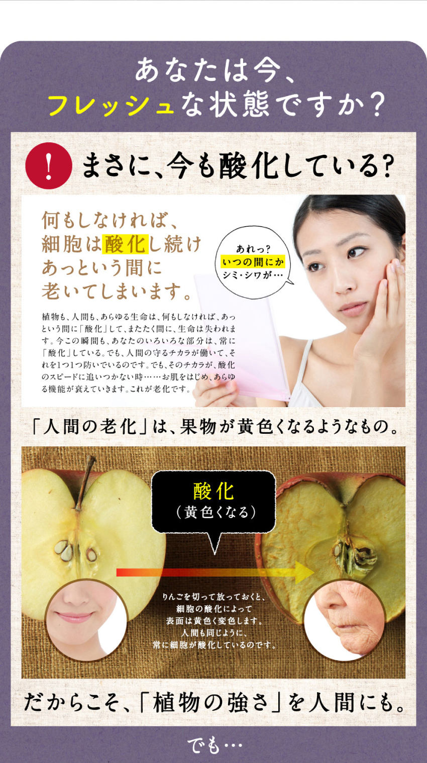 | 【栄養成分】栄養機能食品 (ビタミンC・ビタミンE) ※ビタミンCは、皮膚や粘膜の健康維持を助けるとともに、抗酸化作用を持つ栄養素です。 ※ビタミンEは、抗酸化作用により、体内の脂質を酸化から守り、細胞の健康維持を助ける栄養素です。 (1食分3g中) 1日女性平均摂取カロリー目安 ●熱量:11.2kcal●タンパク質:0.01g●脂質:0.02g ●炭水化物:2.7g〔糖質:2.1g(糖類:0.04g)、食物繊維:0.6g〕●食塩相当量:0.014g ●ビタミンC:228mg(228%) ●ビタミンE:10mg(158%) ※上記の()内の値は、栄養素等表示基準値(18歳以上、基準熱量2,200kcal)に占める割合〔%〕です。 1日約3gを目安として下さい。 区分/栄養機能食品 (ビタミンC・E) 食生活は、主食、主菜、副菜を基本に食事のバランスを。 ※本品は、多量摂取により疾病が治癒したり、より健康が増進するものではありません。 ※1日の摂取目安量をお守り下さい。 ※本品は、特定保健用食品と異なり、消費者庁長官による個別審査を受けたものではありません。 ※原材料で食品アレルギーの心配のある方、体調や体質に合わない場合は使用を中止してください。通院、投薬中の方は担当医にご相談の上お召し上がりください。 | |