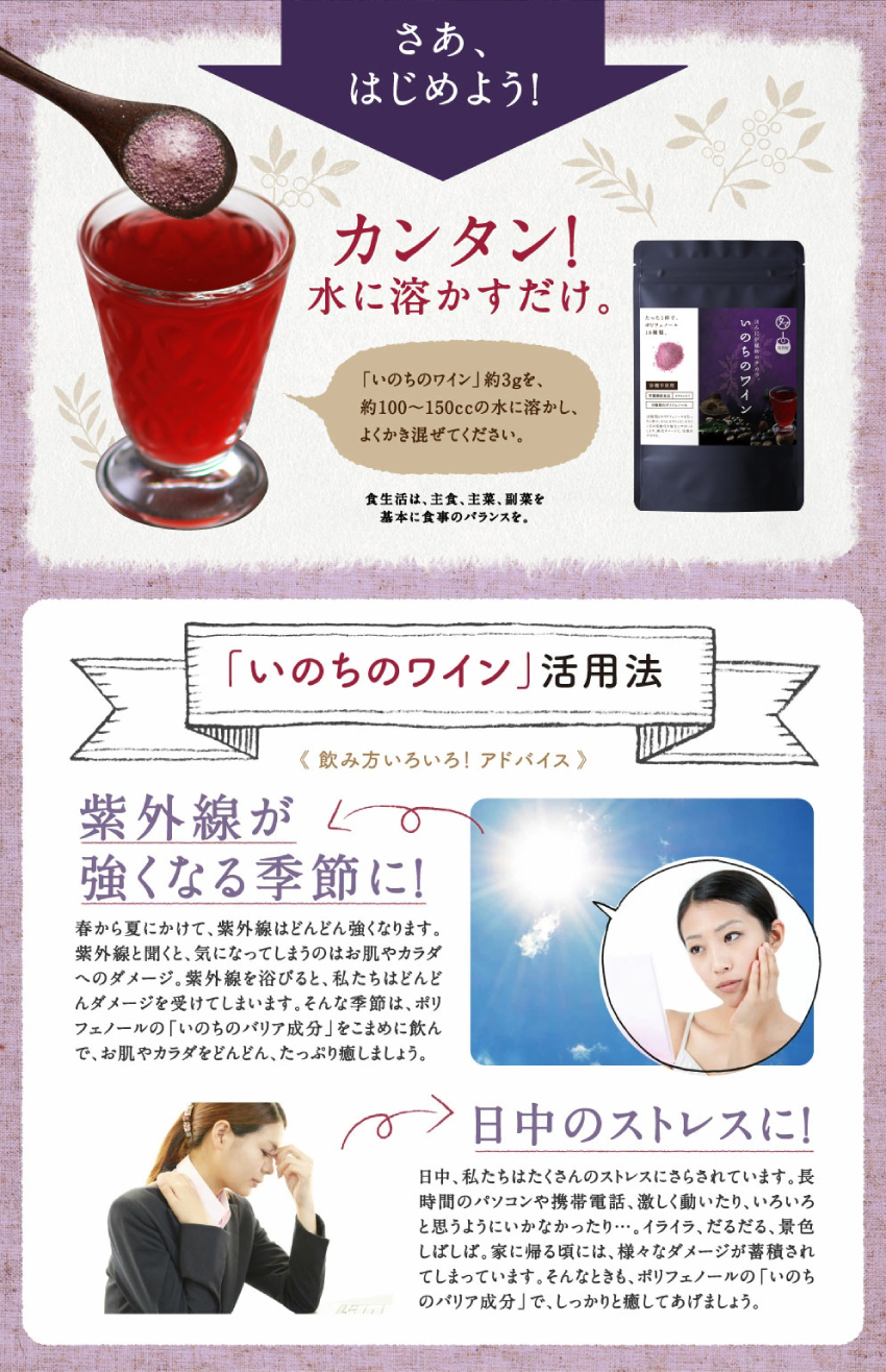 | 【使用方法】1杯1包(3g)を約100ccの水や炭酸水などに溶かしてお飲み下さい。1日又は2日に一杯を目安にご使用下さいませ。 | |