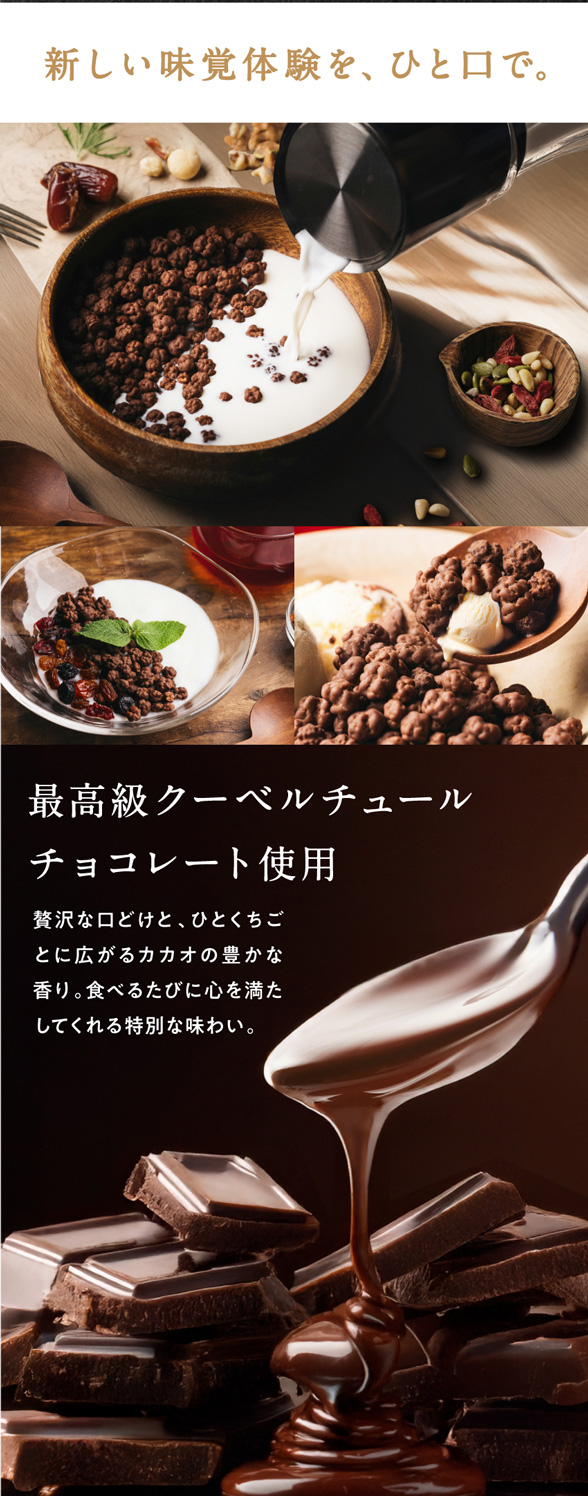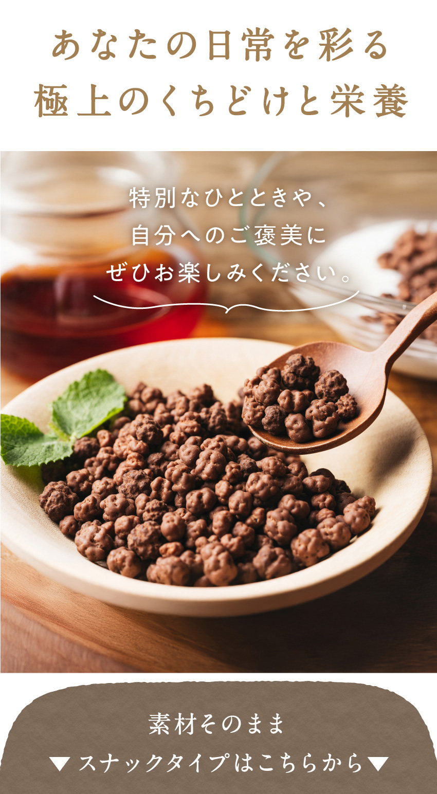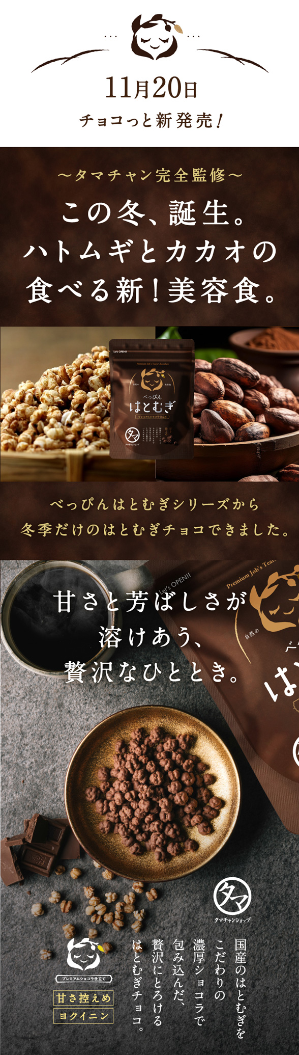 | 【原材料】はとむぎ(国内製造)、イヌリン、植物油脂、カカオマス、全粉乳、ココアバター、オーガニックシュガー、フラクトオリゴ糖/乳化剤、香料、甘味料(ラカンカ抽出物)、(一部に乳成分・大豆を含む) | |