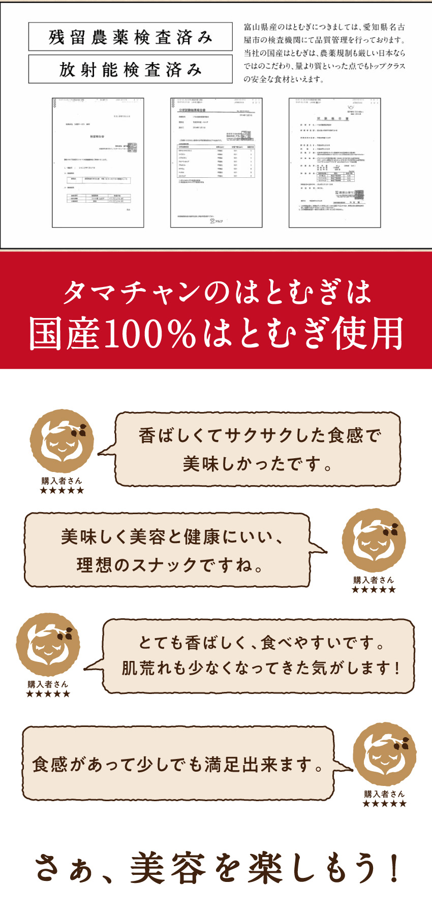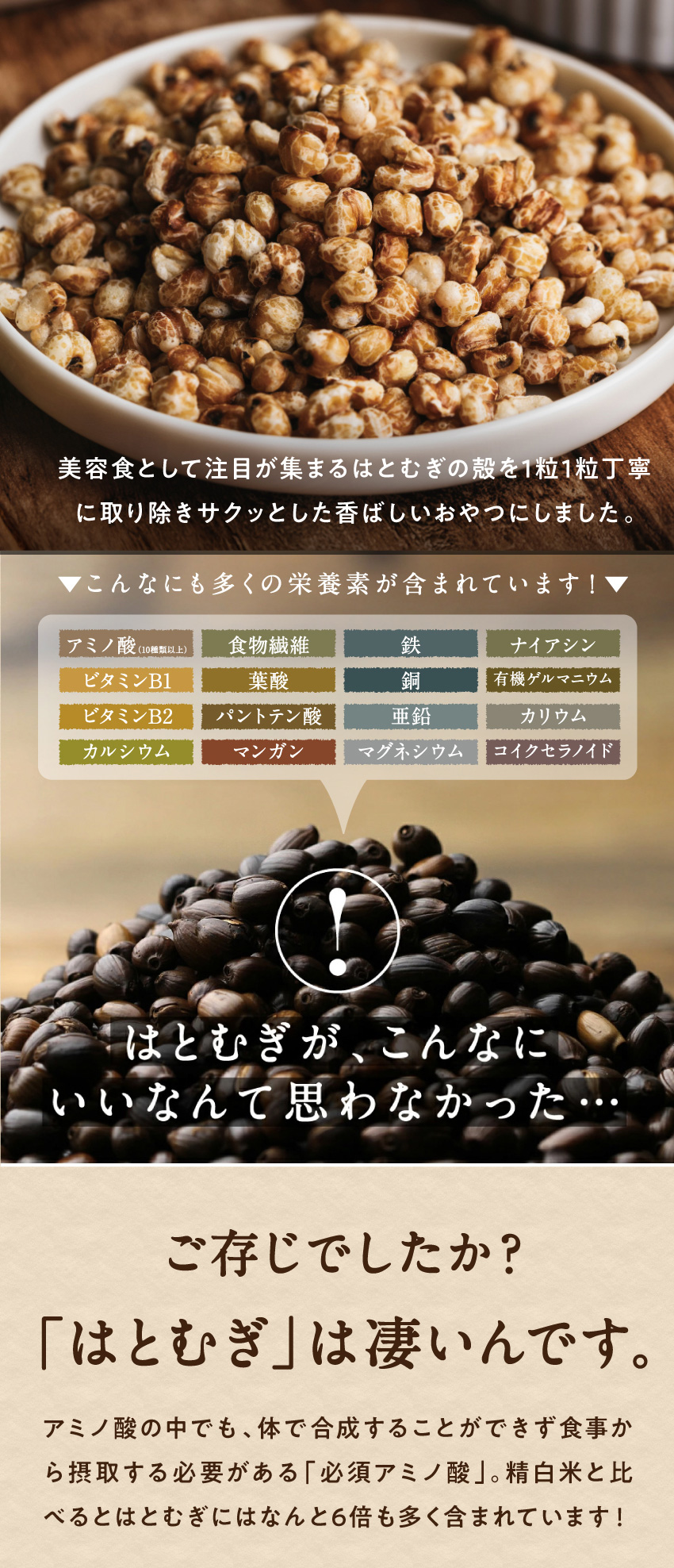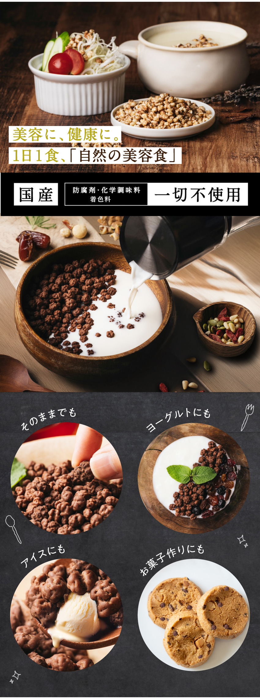 | 【原材料】はとむぎ(国内製造)、イヌリン、植物油脂、カカオマス、全粉乳、ココアバター、オーガニックシュガー、フラクトオリゴ糖/乳化剤、香料、甘味料(ラカンカ抽出物)、(一部に乳成分・大豆を含む) | |