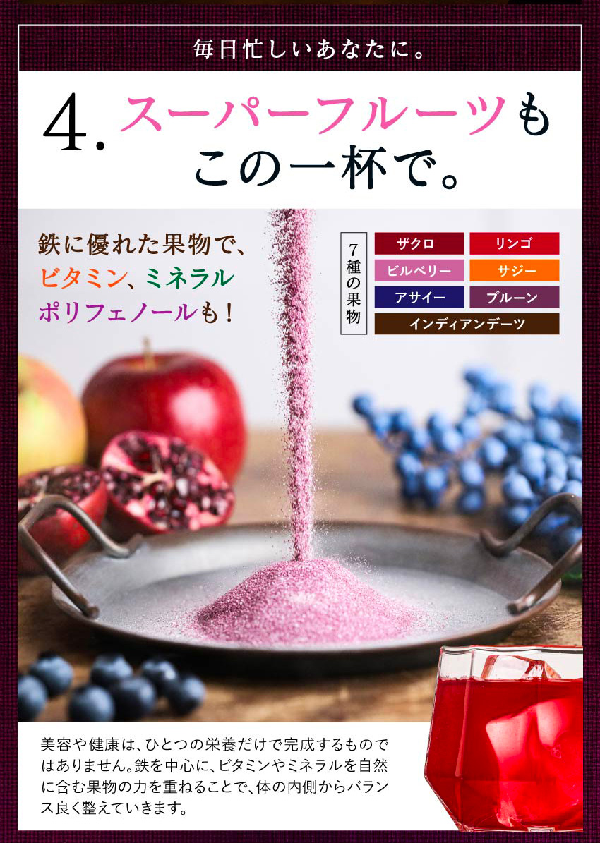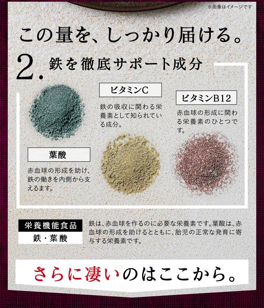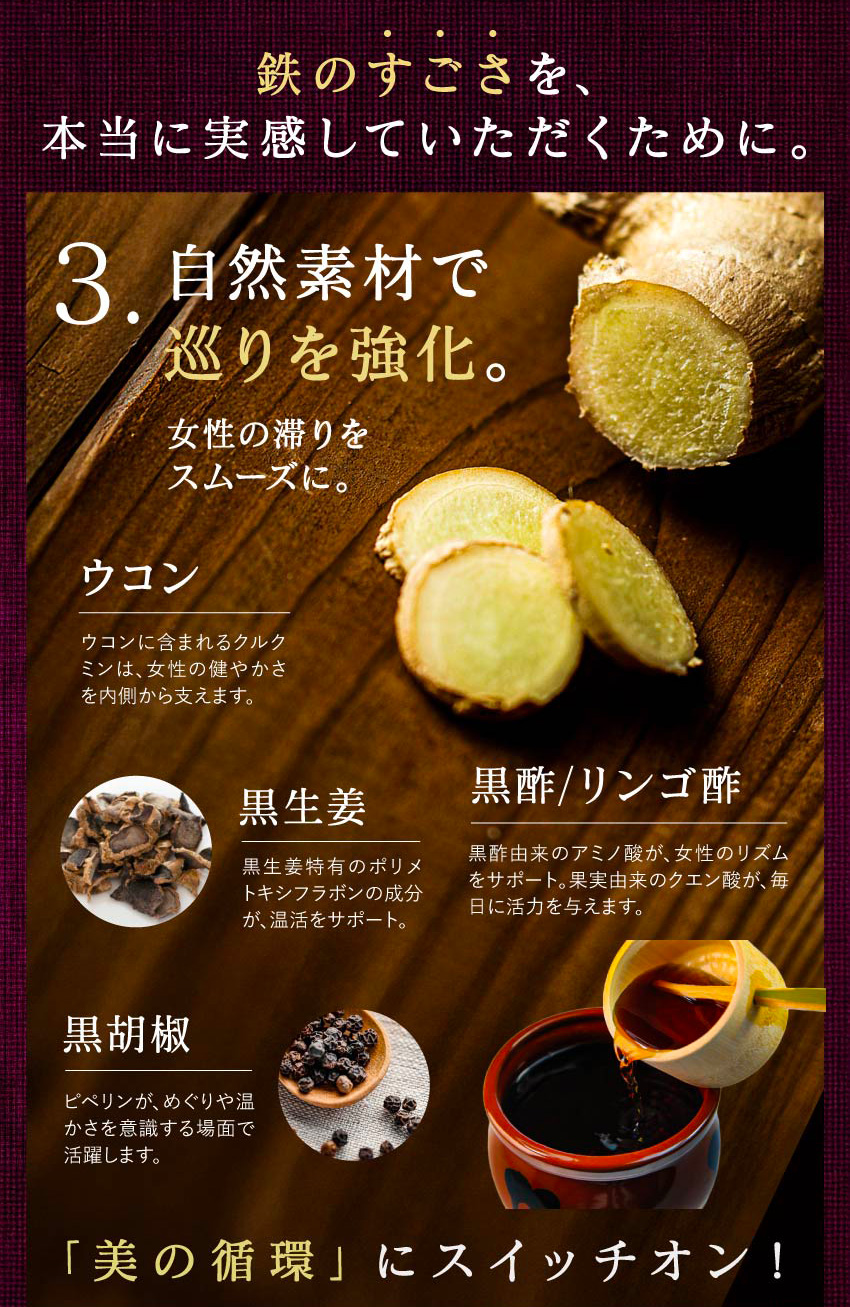 | 【原材料】粉末醸造酢(米酢、デキストリン)(国内製造)、マルチトール、植物抽出物混合末、ビルベリー抽出物、ザクロ抽出物、食塩、インディアンデーツ抽出物、サジー果汁末、ベリー果汁・アサイー抽出物混合末、りんご果汁末、還元型ウコン抽出物、酵母、黒胡椒抽出物、黒酢もろみ末、粉末りんご酢、殺菌乳酸菌末、ブラックジンジャー抽出物、プルーン抽出物/ソルビトール、クエン酸、ビタミンC、二酸化ケイ素、甘味料(ステビア)、シクロデキストリン、ヘム鉄、ピロリン酸鉄、クエン酸カルシウム、香料、葉酸、ビタミンB12 | |