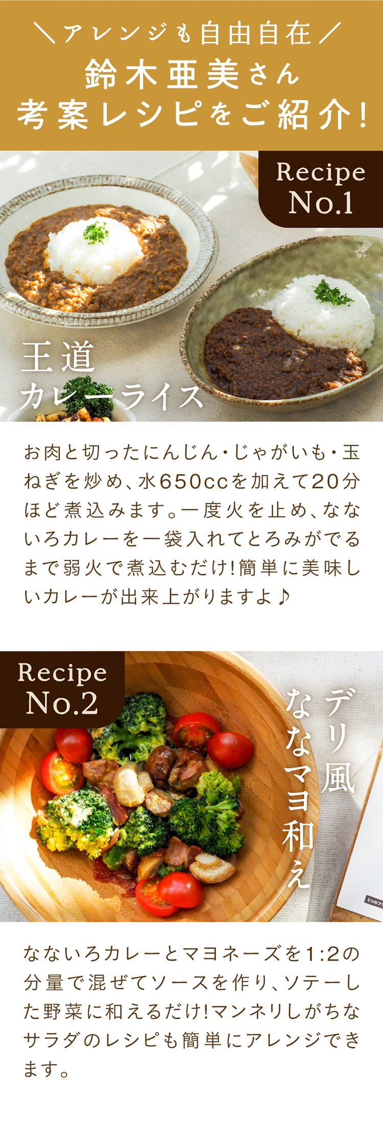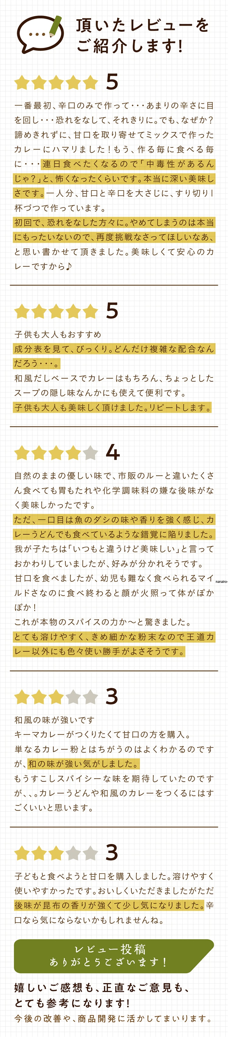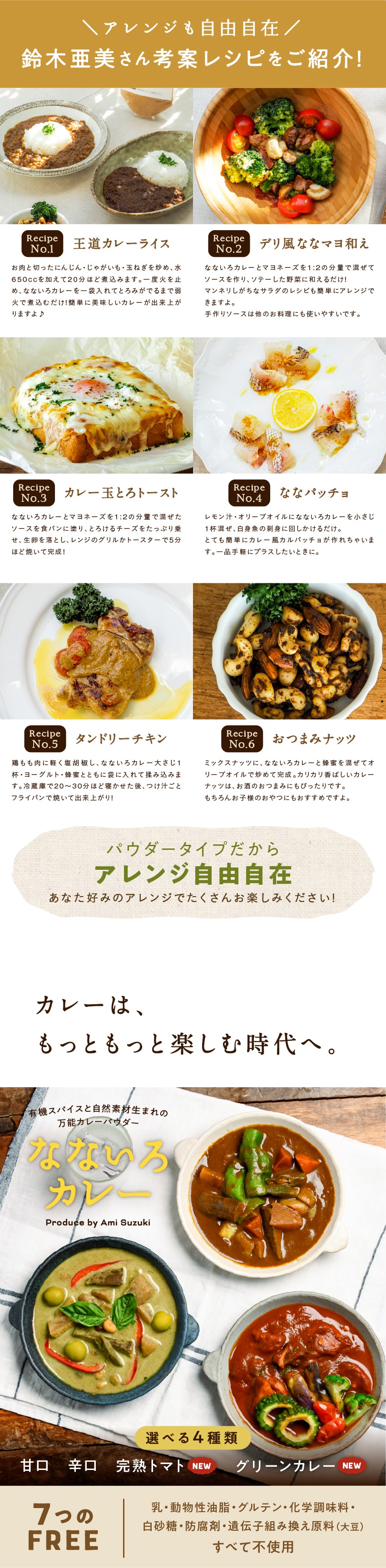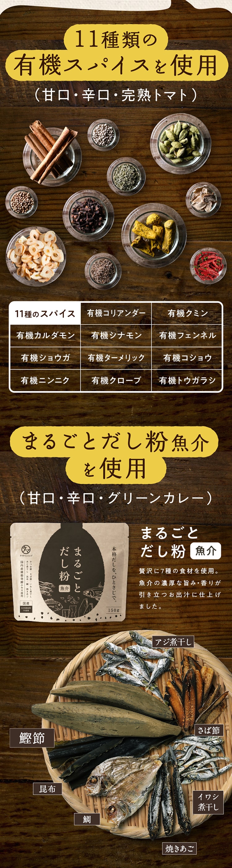 | 【原材料】【甘口】 有機ココナッツシュガー(インドネシア産またはフィリピン産)、りんご粉末、カレースパイス(有機コリアンダー、有機クミン、有機カルダモン、有機シナモン、有機フェンネル、有機ショウガ、有機ターメリック、有機コショウ、有機ニンニク、有機クローブ、有機トウガラシ)、焙煎玄米粉、風味原料(かつお節、さば節、あじ、昆布、干ししいたけ、煮干し、根昆布、焼きあご、食塩砂糖、酵母エキス粉末、発酵調味液(魚しょう、焼酎、穀物発酵液)、しょうゆ粉末)、玉ねぎ粉末、食塩(満潮の塩)、トマト粉末、プルーン粉末、白麹味噌粉末、赤麹味噌粉末、カカオパウダー、ブロッコリー粉末、安納芋粉末、かぼちゃ粉末、ほうれん草粉末、ゴボウ粉末、レンコン粉末、(原材料の一部に小麦、さば、大豆、りんごを含む) 【辛口】 有機ココナッツシュガー(インドネシア産またはフィリピン産)、りんご粉末、カレースパイス(有機コリアンダー、有機クミン、有機コショウ、有機カルダモン、有機シナモン、有機フェンネル、有機ショウガ、有機ターメリック、有機トウガラシ、有機ニンニク、有機クローブ)、焙煎玄米粉、風味原料(かつお節、さば節、あじ、昆布、干ししいたけ、煮干し、根昆布、焼きあご、食塩、砂糖、酵母エキス粉末、発酵調味液(魚しょう、焼酎、穀物発酵液)、しょうゆ粉末)、玉ねぎ粉末、食塩(満潮の塩)、トマト粉末、プルーン粉末、白麹味噌粉末、赤麹味噌粉末、カカオパウダー、ブロッコリー粉末、安納芋粉末、かぼちゃ粉末、ほうれん草粉末、ゴボウ粉末、レンコン粉末、(原材料の一部に小麦、さば、大豆、りんごを含む) |