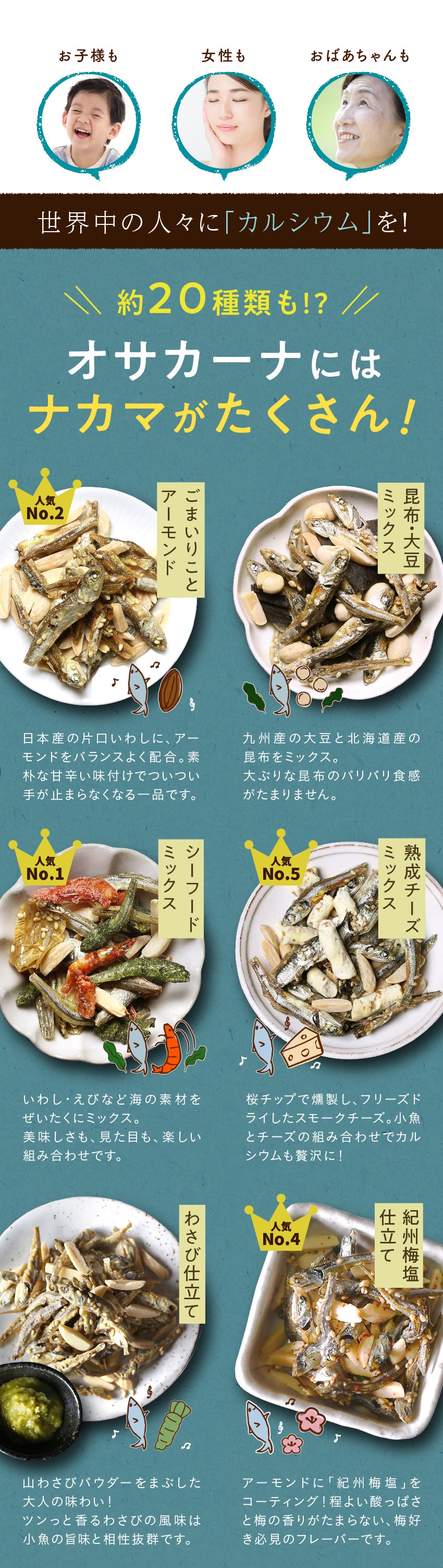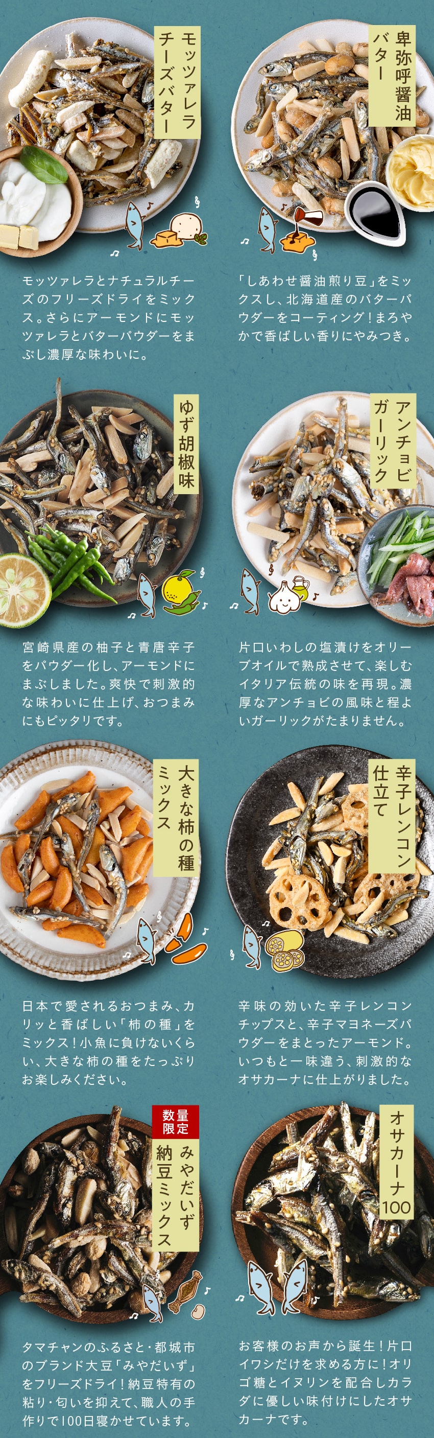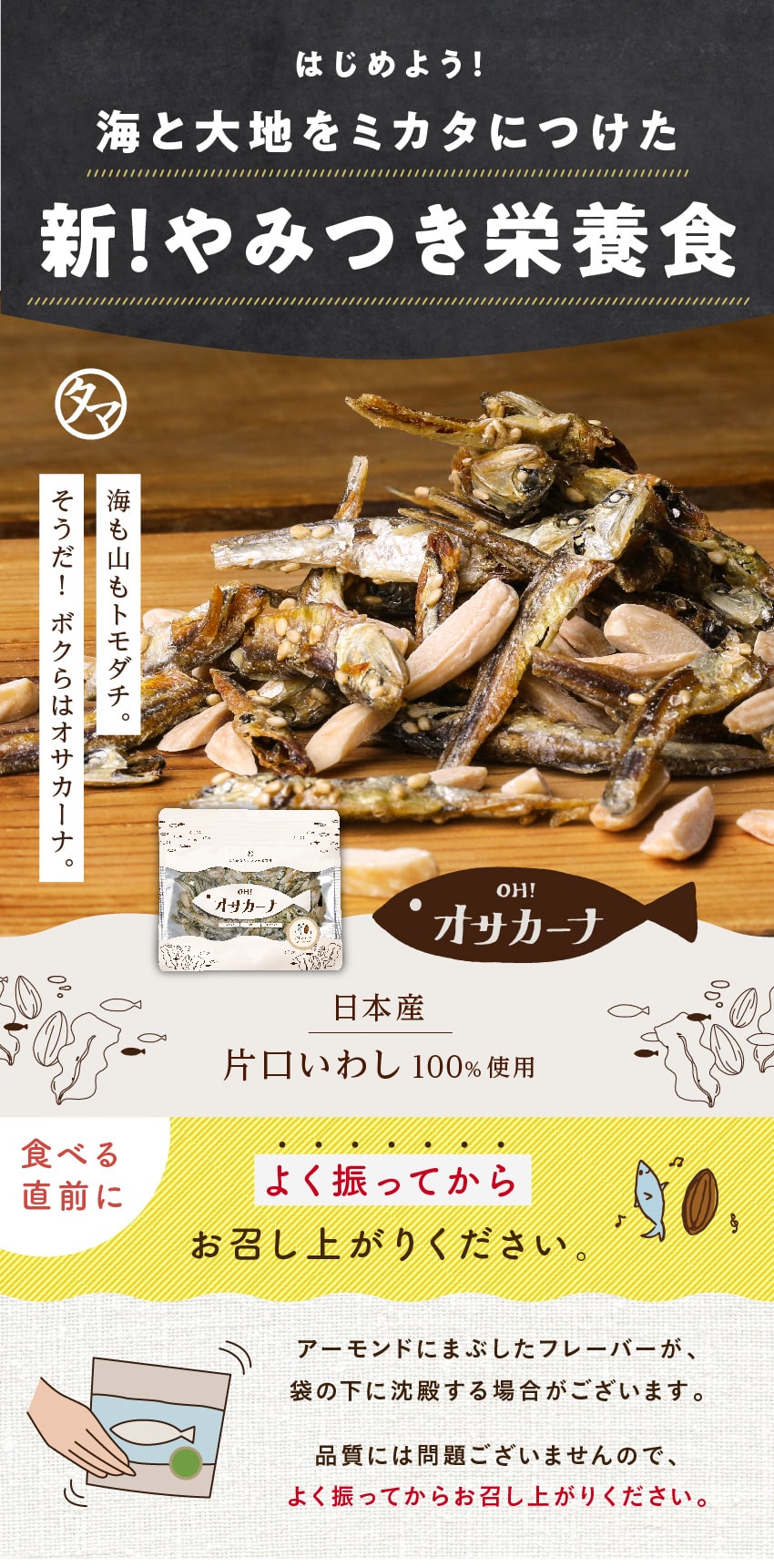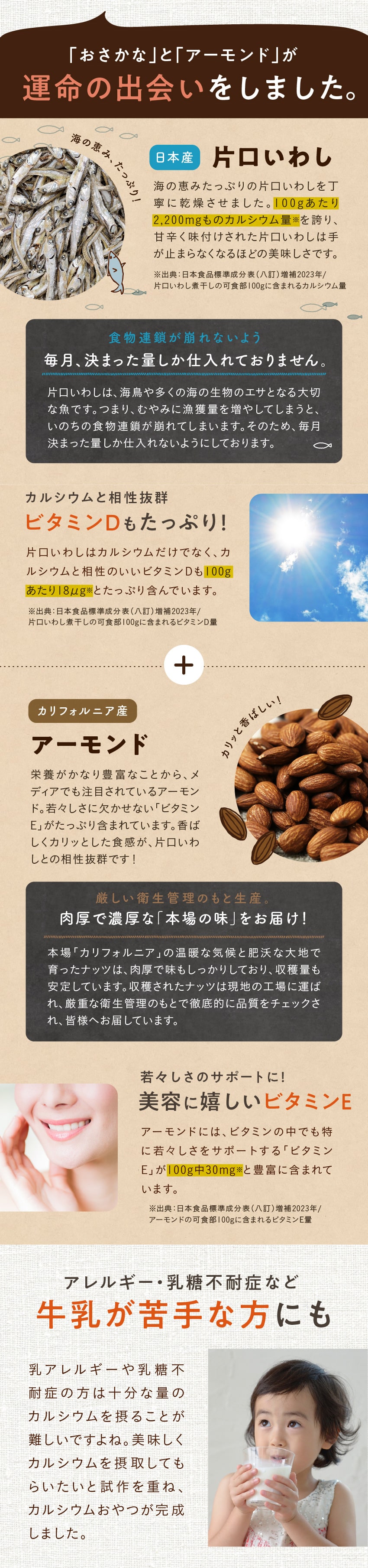 | 【原材料】●ごまいりこ&アーモンド:いわし煮干し(国内製造)、アーモンド(アメリカ産)、砂糖、白ごま、醤油、澱粉分解物、食塩/調味料(アミノ酸等)、(一部に小麦・大豆・ごま・アーモンドを含む) ●チーズミックス:いわし煮干し(国内製造)、アーモンド(アメリカ産)、プロセスチーズ、砂糖、白ごま、醤油、澱粉分解物、食塩/調味料(アミノ酸等)、乳化剤、(一部に小麦・大豆・ごま・乳成分・アーモンドを含む) ●昆布・大豆ミックス:いわし煮干し(国内製造)、アーモンド(アメリカ産)、大豆(九州産/分別生産流通管理済み)、昆布(北海道産)、砂糖、食塩、白ごま、還元水飴、醤油、澱粉分解物、乳糖/調味料(アミノ酸)、(一部に小麦・大豆・ごま・乳成分・アーモンドを含む) ●オサカーナ(シーフード):アーモンド(アメリカ産)、いわし煮干し(国内製造)、煮干いわし、煮干えび、砂糖、麦芽糖、青のり粉、水飴、ごま、醤油、煮干調味料、ワイン調味料、魚醤、食塩、魚肉エキス、香辛料、澱粉分解物/調味料(アミノ酸等)、(一部にえび・小麦・大豆・ごま・アーモンドを含む) ※本品製造工場では、かに、いか、卵、乳、落花生、カシューナッツ、マカデミアナッツ、くるみ、さば、さけ、大豆、小麦、バナナ、りんご、ゼラチンを含む製品を生産しています。 ●わさび味:いわし煮干し(国内製造)・アーモンド(カリフォルニア産)・砂糖・わさび粉末(西洋わさび、食塩、デキストリン、砂糖、唐辛子)・ごま・しょうゆ・澱粉分解物・食塩・調味料(アミノ酸等)、香料(一部に小麦・大豆、ごま、アーモンドを含む) ●紀州梅塩仕立て:いわし煮干し(国内製造)、アーモンド(カリフォルニア産)、砂糖、梅しそシーズニング(デキストリン、ぶどう糖、食塩、乾燥梅肉、乾燥赤しそ)、ごま、しょうゆ、澱粉分解物、食塩/調味料(アミノ酸等)、酸味料、香料、(一部に小麦・大豆・ごま・アーモンドを含む) <!-- ●なないろチーズカレー:いわし煮干し(国内製造)、アーモンド(アメリカ産)、乾燥プロセスチーズ、砂糖、麦芽糖、白ごま、りんご粉末、だし粉末(かつお節、さば節、あじ煮干し、昆布、干ししいたけ、いわし煮干し、根昆布、焼きあご)、カレースパイス、焙煎玄米粉、玉ねぎ末、ココナッツ末、トマト末、白麹味噌末、赤麹味噌末、プルーン末、食塩、ブロッコリー末、安納芋末、ほうれん草末、ゴボウ末、レンコン末、香辛料/乳化剤、(一部にごま・りんご・乳成分、ごま、アーモンドを含む) --> ●卑弥呼しょうゆバター:いわし煮干し(国内製造)、アーモンド(アメリカ産)、大豆(国内産/分別生産流通管理済み)、白ごま、砂糖、麦芽糖、醤油、バターシーズニング(バターミルクパウダー、食塩、ぶどう糖、たん白加水分解物、酵母エキス)/調味料(アミノ酸等)、香料、ケイ酸カルシウム、(一部に、小麦・大豆・ごま・乳成分・アーモンドを含む) ●モッツァレラチーズバター:いわし煮干し(国内製造)、アーモンド(アメリカ産)、プロセスチーズ、粉末チーズ(モッツァレラ)、白ごま、食塩、砂糖、麦芽糖、バターミルク粉末、醤油、デキストリン、酵母エキス粉末/香辛料、調味料(アミノ酸等)、香料、リン酸三カルシウム、乳化剤、(一部に小麦・大豆・乳成分・ごま・アーモンドを含む) ●ゆず胡椒仕立て:いわし煮干し(国内製造)、アーモンド(カリフォルニア産)、ゆずパウダー(宮崎産)、食塩、香辛料(青唐辛子、陳皮)、デキストリン、砂糖、レモン果汁パウダー、白ごま、しょうゆ、澱粉分解物/調味料(アミノ酸)、香料、酸味料、リン酸三カルシウム(一部に大豆・小麦、ごま、アーモンドを含む) ●アンチョビガーリック:いわし煮干し(国内製造)、アーモンド(カリフォルニア産)、アンチョビパウダー、たん白加水分解物、ガーリック末、鰹節エキスパウダー、昆布エキスパウダー、砂糖、白ごま、しょうゆ、澱粉分解物、食塩/調味料(アミノ酸)、香辛料抽出物、ケイ酸カルシウム、酸化防止剤(V.E)(一部に大豆・小麦・魚介類、ごま、アーモンドを含む) ●大きな柿の種ミックス:いわし煮干し(国内製造)、アーモンド(アメリカ産)、砂糖、白ごま、しょうゆ、澱粉分解物、食塩、でん粉、米(国産)、デキストリン、かつおエキス、唐辛子、加工デンプン/調味料(アミノ酸等)、乳化剤、(一部に大豆・小麦・ごま・乳成分・アーモンドを含む) ●焼き安納スイートポテト:いわし煮干し(国内製造)、アーモンド(アメリカ産)、安納芋、植物性油脂、砂糖、安納芋粉末、食塩、グラニュー糖、デキストリン、白ごま、粉末卵黄、酵母エキス調味料、澱粉分解物/香料、甘味料(ステビア)、リン酸三カルシウム、調味料(アミノ酸等)(一部に卵・ごま・アーモンドを含む) ●博多明太イワシ&チーズ:いわし煮干し(国内製造)、アーモンド(アメリカ産)、プロセスチーズ(ナチュラルチーズ、明太子風味調味料)、砂糖、辛子明太子加工品(辛子明太子ばらこ、デキストリン、植物油脂、でん粉)、醤油、白ごま、澱粉分解物、食塩、バターシーズニング(バターミルクパ