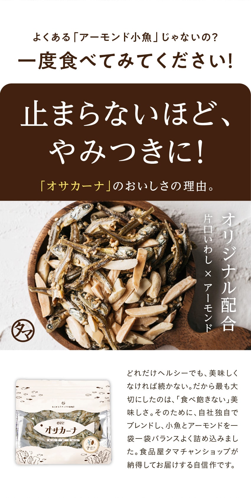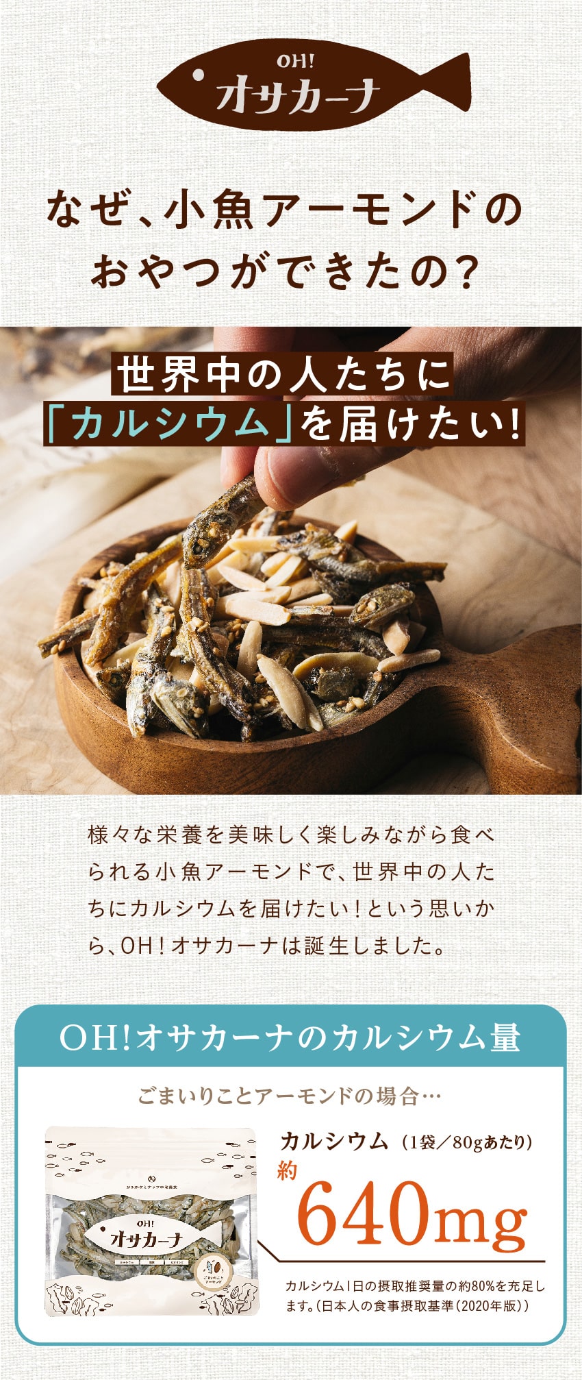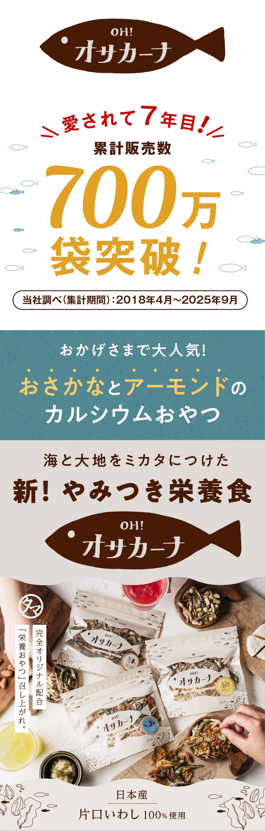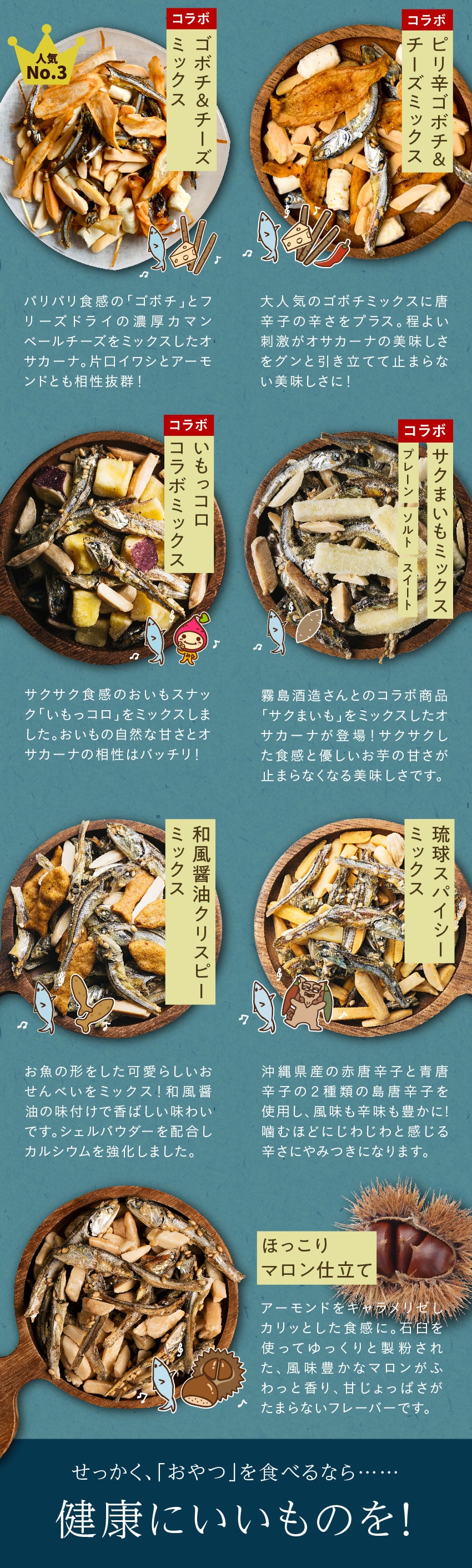 | 【原材料】●ごまいりこ&アーモンド:いわし煮干し(国内製造)、アーモンド(アメリカ産)、砂糖、白ごま、醤油、澱粉分解物、食塩/調味料(アミノ酸等)、(一部に小麦・大豆・ごま・アーモンドを含む) ●チーズミックス:いわし煮干し(国内製造)、アーモンド(アメリカ産)、プロセスチーズ、砂糖、白ごま、醤油、澱粉分解物、食塩/調味料(アミノ酸等)、乳化剤、(一部に小麦・大豆・ごま・乳成分・アーモンドを含む) ●昆布・大豆ミックス:いわし煮干し(国内製造)、アーモンド(アメリカ産)、大豆(九州産/分別生産流通管理済み)、昆布(北海道産)、砂糖、食塩、白ごま、還元水飴、醤油、澱粉分解物、乳糖/調味料(アミノ酸)、(一部に小麦・大豆・ごま・乳成分・アーモンドを含む) ●オサカーナ(シーフード):アーモンド(アメリカ産)、いわし煮干し(国内製造)、煮干いわし、煮干えび、砂糖、麦芽糖、青のり粉、水飴、ごま、醤油、煮干調味料、ワイン調味料、魚醤、食塩、魚肉エキス、香辛料、澱粉分解物/調味料(アミノ酸等)、(一部にえび・小麦・大豆・ごま・アーモンドを含む) ※本品製造工場では、かに、いか、卵、乳、落花生、カシューナッツ、マカデミアナッツ、くるみ、さば、さけ、大豆、小麦、バナナ、りんご、ゼラチンを含む製品を生産しています。 ●わさび味:いわし煮干し(国内製造)・アーモンド(カリフォルニア産)・砂糖・わさび粉末(西洋わさび、食塩、デキストリン、砂糖、唐辛子)・ごま・しょうゆ・澱粉分解物・食塩・調味料(アミノ酸等)、香料(一部に小麦・大豆、ごま、アーモンドを含む) ●紀州梅塩仕立て:いわし煮干し(国内製造)、アーモンド(カリフォルニア産)、砂糖、梅しそシーズニング(デキストリン、ぶどう糖、食塩、乾燥梅肉、乾燥赤しそ)、ごま、しょうゆ、澱粉分解物、食塩/調味料(アミノ酸等)、酸味料、香料、(一部に小麦・大豆・ごま・アーモンドを含む) <!-- ●なないろチーズカレー:いわし煮干し(国内製造)、アーモンド(アメリカ産)、乾燥プロセスチーズ、砂糖、麦芽糖、白ごま、りんご粉末、だし粉末(かつお節、さば節、あじ煮干し、昆布、干ししいたけ、いわし煮干し、根昆布、焼きあご)、カレースパイス、焙煎玄米粉、玉ねぎ末、ココナッツ末、トマト末、白麹味噌末、赤麹味噌末、プルーン末、食塩、ブロッコリー末、安納芋末、ほうれん草末、ゴボウ末、レンコン末、香辛料/乳化剤、(一部にごま・りんご・乳成分、ごま、アーモンドを含む) --> ●卑弥呼しょうゆバター:いわし煮干し(国内製造)、アーモンド(アメリカ産)、大豆(国内産/分別生産流通管理済み)、白ごま、砂糖、麦芽糖、醤油、バターシーズニング(バターミルクパウダー、食塩、ぶどう糖、たん白加水分解物、酵母エキス)/調味料(アミノ酸等)、香料、ケイ酸カルシウム、(一部に、小麦・大豆・ごま・乳成分・アーモンドを含む) ●モッツァレラチーズバター:いわし煮干し(国内製造)、アーモンド(アメリカ産)、プロセスチーズ、粉末チーズ(モッツァレラ)、白ごま、食塩、砂糖、麦芽糖、バターミルク粉末、醤油、デキストリン、酵母エキス粉末/香辛料、調味料(アミノ酸等)、香料、リン酸三カルシウム、乳化剤、(一部に小麦・大豆・乳成分・ごま・アーモンドを含む) ●ゆず胡椒仕立て:いわし煮干し(国内製造)、アーモンド(カリフォルニア産)、ゆずパウダー(宮崎産)、食塩、香辛料(青唐辛子、陳皮)、デキストリン、砂糖、レモン果汁パウダー、白ごま、しょうゆ、澱粉分解物/調味料(アミノ酸)、香料、酸味料、リン酸三カルシウム(一部に大豆・小麦、ごま、アーモンドを含む) ●アンチョビガーリック:いわし煮干し(国内製造)、アーモンド(カリフォルニア産)、アンチョビパウダー、たん白加水分解物、ガーリック末、鰹節エキスパウダー、昆布エキスパウダー、砂糖、白ごま、しょうゆ、澱粉分解物、食塩/調味料(アミノ酸)、香辛料抽出物、ケイ酸カルシウム、酸化防止剤(V.E)(一部に大豆・小麦・魚介類、ごま、アーモンドを含む) ●大きな柿の種ミックス:いわし煮干し(国内製造)、アーモンド(アメリカ産)、砂糖、白ごま、しょうゆ、澱粉分解物、食塩、でん粉、米(国産)、デキストリン、かつおエキス、唐辛子、加工デンプン/調味料(アミノ酸等)、乳化剤、(一部に大豆・小麦・ごま・乳成分・アーモンドを含む) ●焼き安納スイートポテト:いわし煮干し(国内製造)、アーモンド(アメリカ産)、安納芋、植物性油脂、砂糖、安納芋粉末、食塩、グラニュー糖、デキストリン、白ごま、粉末卵黄、酵母エキス調味料、澱粉分解物/香料、甘味料(ステビア)、リン酸三カルシウム、調味料(アミノ酸等)(一部に卵・ごま・アーモンドを含む) ●博多明太イワシ&チーズ:いわし煮干し(国内製造)、アーモンド(アメリカ産)、プロセスチーズ(ナチュラルチーズ、明太子風味調味料)、砂糖、辛子明太子加工品(辛子明太子ばらこ、デキストリン、植物油脂、でん粉)、醤油、白ごま、澱粉分解物、食塩、バターシーズニング(バターミルクパ