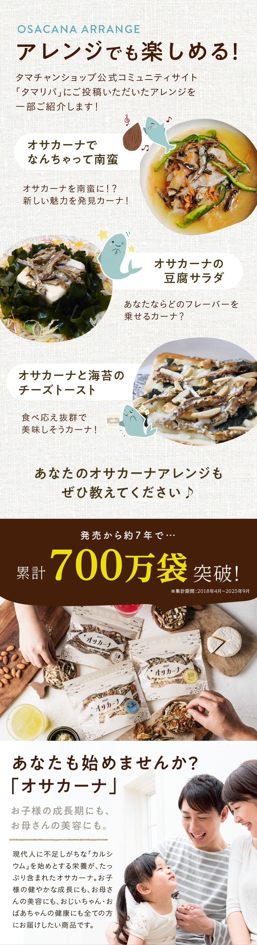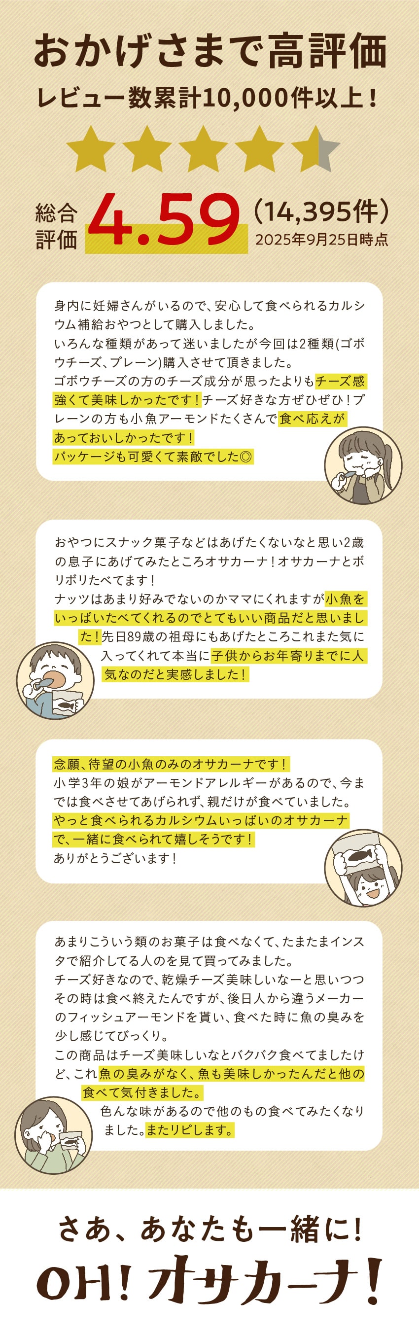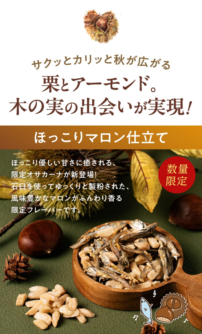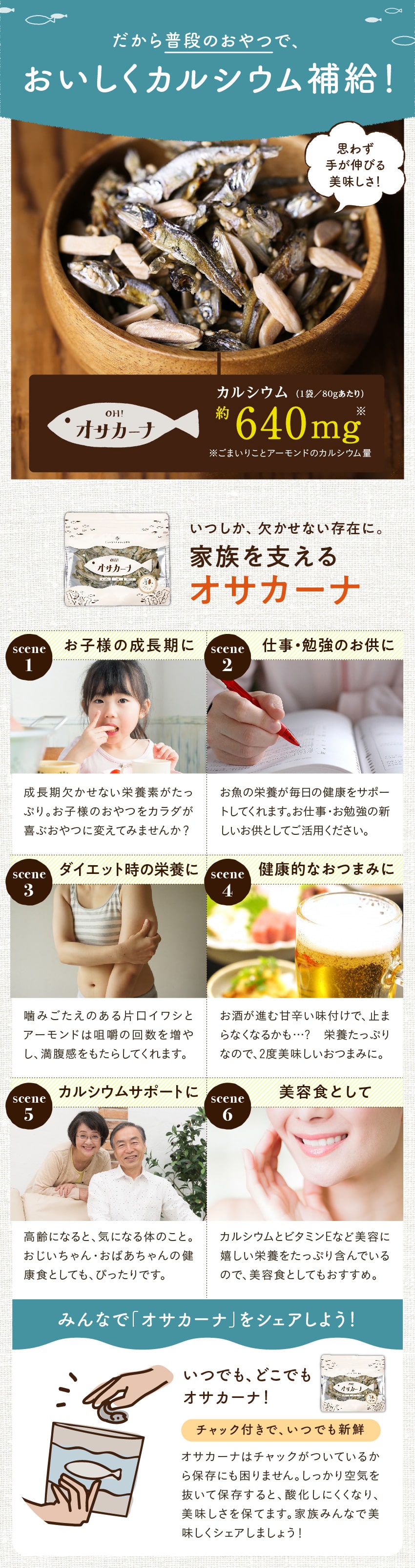 | 【原材料】●ごまいりこ&アーモンド:いわし煮干し(国内製造)、アーモンド(アメリカ産)、砂糖、白ごま、醤油、澱粉分解物、食塩/調味料(アミノ酸等)、(一部に小麦・大豆・ごま・アーモンドを含む) ●チーズミックス:いわし煮干し(国内製造)、アーモンド(アメリカ産)、プロセスチーズ、砂糖、白ごま、醤油、澱粉分解物、食塩/調味料(アミノ酸等)、乳化剤、(一部に小麦・大豆・ごま・乳成分・アーモンドを含む) ●昆布・大豆ミックス:いわし煮干し(国内製造)、アーモンド(アメリカ産)、大豆(九州産/分別生産流通管理済み)、昆布(北海道産)、砂糖、食塩、白ごま、還元水飴、醤油、澱粉分解物、乳糖/調味料(アミノ酸)、(一部に小麦・大豆・ごま・乳成分・アーモンドを含む) ●オサカーナ(シーフード):アーモンド(アメリカ産)、いわし煮干し(国内製造)、煮干いわし、煮干えび、砂糖、麦芽糖、青のり粉、水飴、ごま、醤油、煮干調味料、ワイン調味料、魚醤、食塩、魚肉エキス、香辛料、澱粉分解物/調味料(アミノ酸等)、(一部にえび・小麦・大豆・ごま・アーモンドを含む) ※本品製造工場では、かに、いか、卵、乳、落花生、カシューナッツ、マカデミアナッツ、くるみ、さば、さけ、大豆、小麦、バナナ、りんご、ゼラチンを含む製品を生産しています。 ●わさび味:いわし煮干し(国内製造)・アーモンド(カリフォルニア産)・砂糖・わさび粉末(西洋わさび、食塩、デキストリン、砂糖、唐辛子)・ごま・しょうゆ・澱粉分解物・食塩・調味料(アミノ酸等)、香料(一部に小麦・大豆、ごま、アーモンドを含む) ●紀州梅塩仕立て:いわし煮干し(国内製造)、アーモンド(カリフォルニア産)、砂糖、梅しそシーズニング(デキストリン、ぶどう糖、食塩、乾燥梅肉、乾燥赤しそ)、ごま、しょうゆ、澱粉分解物、食塩/調味料(アミノ酸等)、酸味料、香料、(一部に小麦・大豆・ごま・アーモンドを含む) <!-- ●なないろチーズカレー:いわし煮干し(国内製造)、アーモンド(アメリカ産)、乾燥プロセスチーズ、砂糖、麦芽糖、白ごま、りんご粉末、だし粉末(かつお節、さば節、あじ煮干し、昆布、干ししいたけ、いわし煮干し、根昆布、焼きあご)、カレースパイス、焙煎玄米粉、玉ねぎ末、ココナッツ末、トマト末、白麹味噌末、赤麹味噌末、プルーン末、食塩、ブロッコリー末、安納芋末、ほうれん草末、ゴボウ末、レンコン末、香辛料/乳化剤、(一部にごま・りんご・乳成分、ごま、アーモンドを含む) --> ●卑弥呼しょうゆバター:いわし煮干し(国内製造)、アーモンド(アメリカ産)、大豆(国内産/分別生産流通管理済み)、白ごま、砂糖、麦芽糖、醤油、バターシーズニング(バターミルクパウダー、食塩、ぶどう糖、たん白加水分解物、酵母エキス)/調味料(アミノ酸等)、香料、ケイ酸カルシウム、(一部に、小麦・大豆・ごま・乳成分・アーモンドを含む) ●モッツァレラチーズバター:いわし煮干し(国内製造)、アーモンド(アメリカ産)、プロセスチーズ、粉末チーズ(モッツァレラ)、白ごま、食塩、砂糖、麦芽糖、バターミルク粉末、醤油、デキストリン、酵母エキス粉末/香辛料、調味料(アミノ酸等)、香料、リン酸三カルシウム、乳化剤、(一部に小麦・大豆・乳成分・ごま・アーモンドを含む) ●ゆず胡椒仕立て:いわし煮干し(国内製造)、アーモンド(カリフォルニア産)、ゆずパウダー(宮崎産)、食塩、香辛料(青唐辛子、陳皮)、デキストリン、砂糖、レモン果汁パウダー、白ごま、しょうゆ、澱粉分解物/調味料(アミノ酸)、香料、酸味料、リン酸三カルシウム(一部に大豆・小麦、ごま、アーモンドを含む) ●アンチョビガーリック:いわし煮干し(国内製造)、アーモンド(カリフォルニア産)、アンチョビパウダー、たん白加水分解物、ガーリック末、鰹節エキスパウダー、昆布エキスパウダー、砂糖、白ごま、しょうゆ、澱粉分解物、食塩/調味料(アミノ酸)、香辛料抽出物、ケイ酸カルシウム、酸化防止剤(V.E)(一部に大豆・小麦・魚介類、ごま、アーモンドを含む) ●大きな柿の種ミックス:いわし煮干し(国内製造)、アーモンド(アメリカ産)、砂糖、白ごま、しょうゆ、澱粉分解物、食塩、でん粉、米(国産)、デキストリン、かつおエキス、唐辛子、加工デンプン/調味料(アミノ酸等)、乳化剤、(一部に大豆・小麦・ごま・乳成分・アーモンドを含む) ●焼き安納スイートポテト:いわし煮干し(国内製造)、アーモンド(アメリカ産)、安納芋、植物性油脂、砂糖、安納芋粉末、食塩、グラニュー糖、デキストリン、白ごま、粉末卵黄、酵母エキス調味料、澱粉分解物/香料、甘味料(ステビア)、リン酸三カルシウム、調味料(アミノ酸等)(一部に卵・ごま・アーモンドを含む) ●博多明太イワシ&チーズ:いわし煮干し(国内製造)、アーモンド(アメリカ産)、プロセスチーズ(ナチュラルチーズ、明太子風味調味料)、砂糖、辛子明太子加工品(辛子明太子ばらこ、デキストリン、植物油脂、でん粉)、醤油、白ごま、澱粉分解物、食塩、バターシーズニング(バターミルクパ