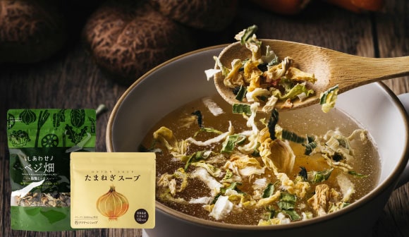 《12/22はスープの日》たまねぎスープとベジ畑の選べるセット!調理不要で簡単に野菜たっぷりのたまねぎスープを楽しめますよ。栄養が偏りやすい方におすすめのセットです。