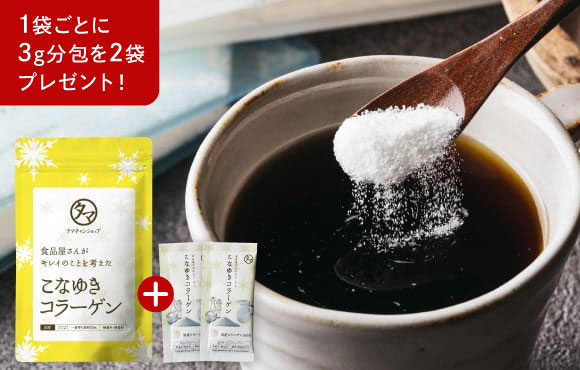 低分子化したコラーゲンパウダー。無味無臭に近く、お料理やドリンクに入れて混ぜるだけでお手軽にコラーゲンを補給できます。キレイに願いを込めて、こなゆきコラーゲンを始めてみませんか?
