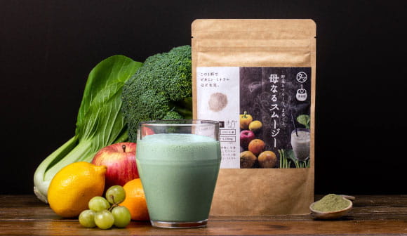 1杯で、一日分のビタミン・鉄分と食物繊維をほぼ充足。たっぷりの野菜と果物の栄養を凝縮した「スムージー粉末」です。栄養・野菜不足が気になる方におすすめです。